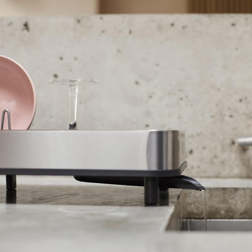 A veces son solo un par de tazas y platos. Y a veces, después de la cena, sientes que acabas de servir a una pequeña cafetería. El escurreplatos compacto hace su trabajo a su manera: la mayor parte del tiempo permanece discretamente estrecho, pero cuando los platos comienzan a poner a prueba la capacidad de la encimera, simplemente lo expandes y creas más espacio para secar.