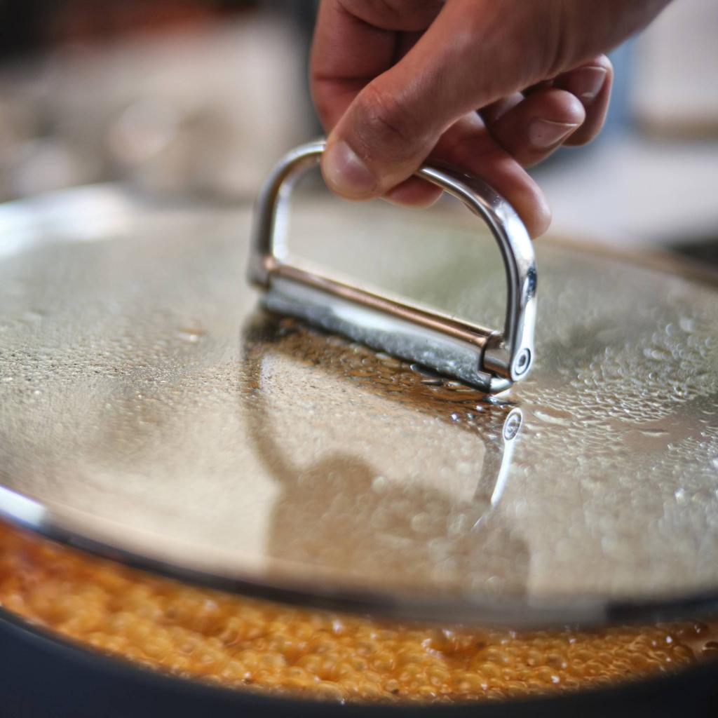 - Tapa para cazo están hechos de vidrio templado con borde de acero inoxidable y asas plegables de acero inoxidable para un almacenamiento compacto y claro.