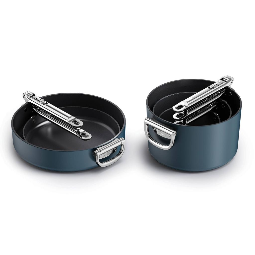 - Gracias a sus asas plegables, las piezas se pueden apilar fácilmente unas dentro de otras, ahorrando hasta un 50 % más de espacio de almacenamiento en comparación con las ollas y sartenes convencionales.