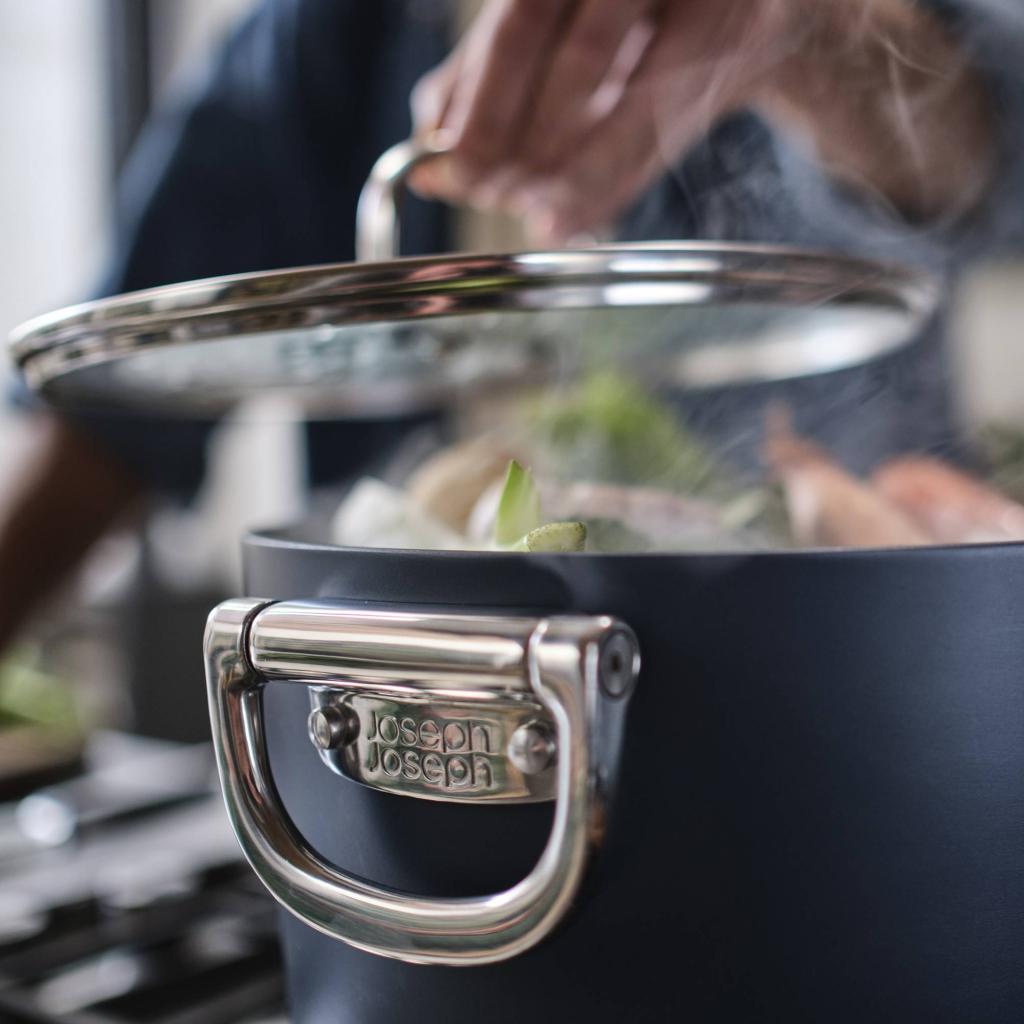 Batería de cocina que entiende las realidades de la cocina moderna - Joseph Joseph SPACE. Durante la cocción, se mantiene firme y seguro, listo para manejar todo, desde un desayuno rápido hasta una cena improvisada. Pero cuando llega el momento de guardar, cambia de carácter y se adapta discretamente al espacio, sin reclamar más sitio del estrictamente necesario. ¿Qué más se puede pedir?