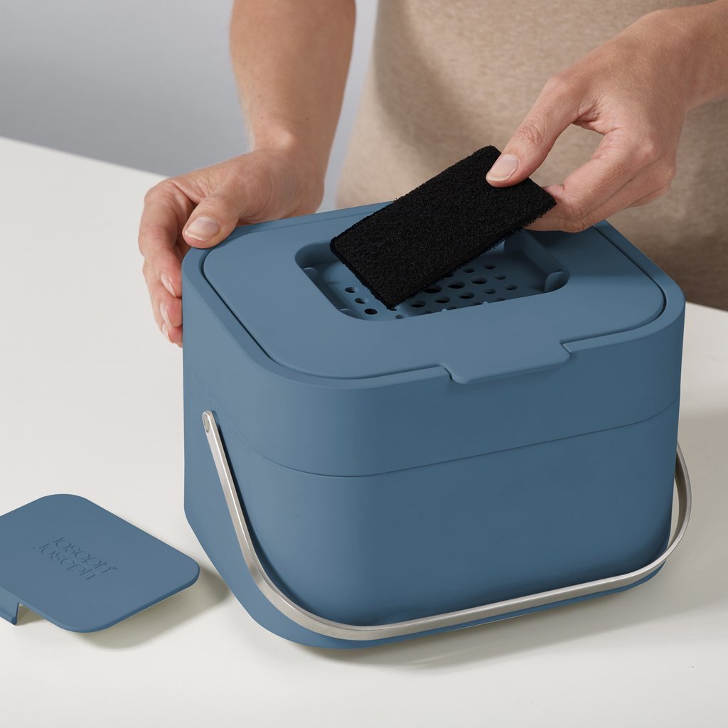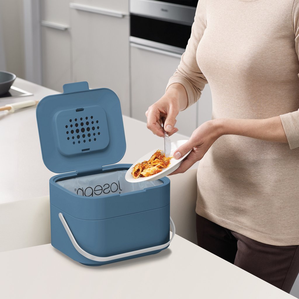 el contenedor de 4 litros con filtro de carbón está diseñado para los residuos compostables; gracias al filtro, también puede utilizarse en la encimera de la cocina como solución ecológica para los residuos descomponibles y los restos de comida. Si quieres compostar las sobras, debes utilizar bolsas degradables. El contenedor para el contenido compostable está preparado para reducir el olor producido por los procesos orgánicos. La circulación del aire funciona de forma natural gracias a la doble pared. A continuación, el aire se filtra a través de un filtro de carbón en la tapa del recipiente.