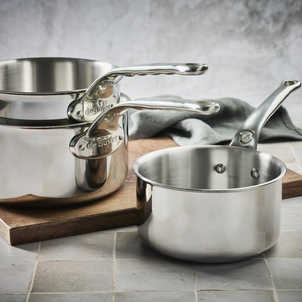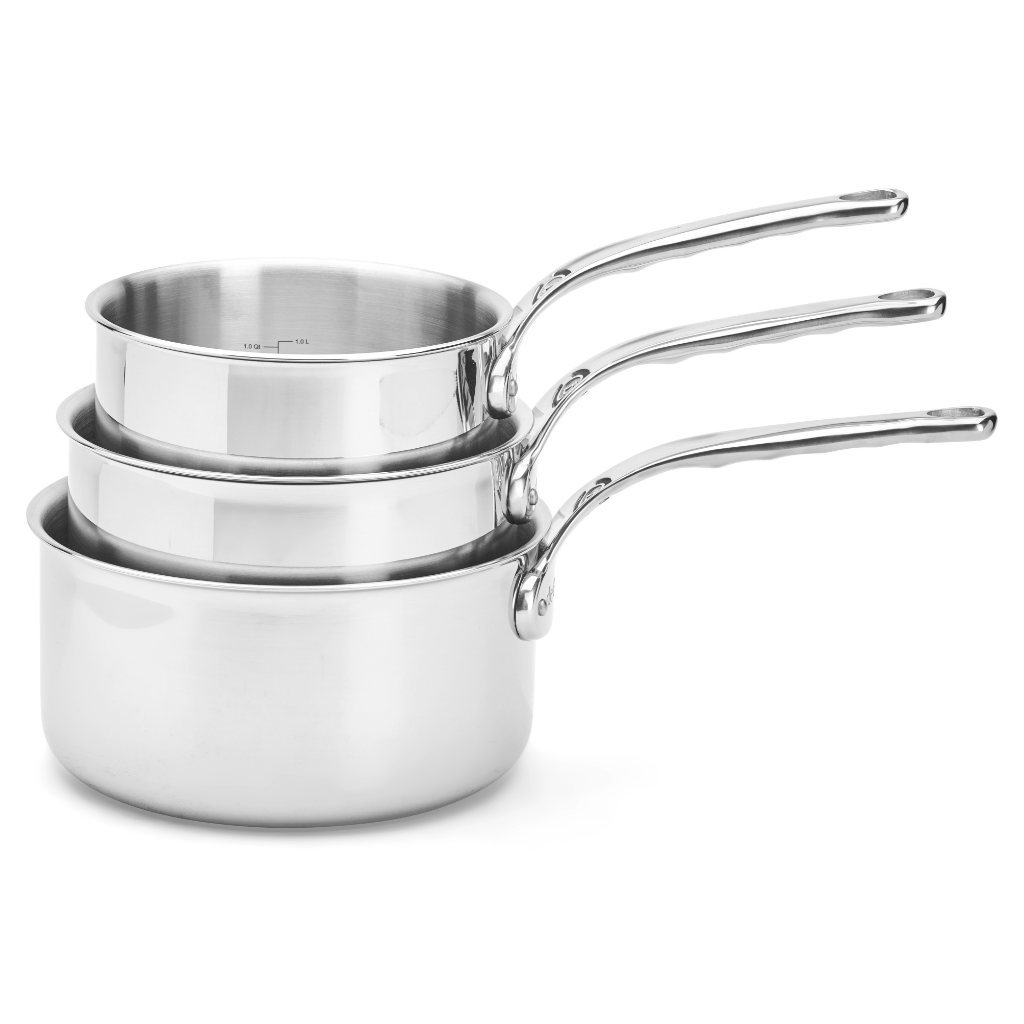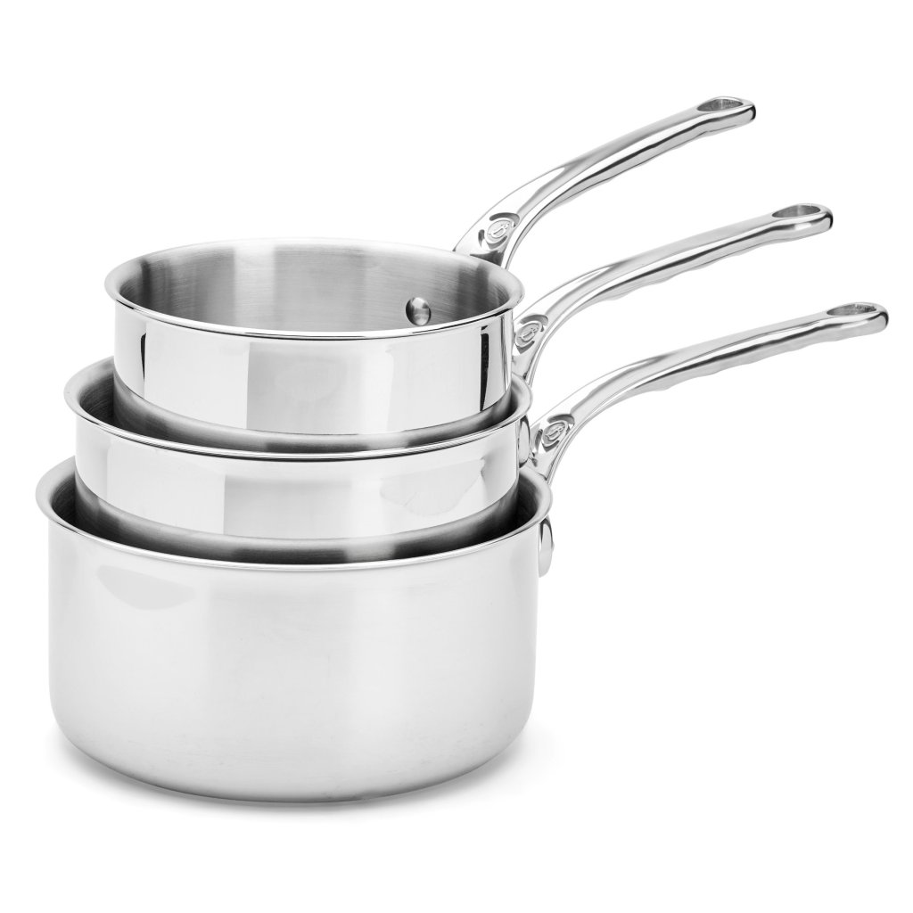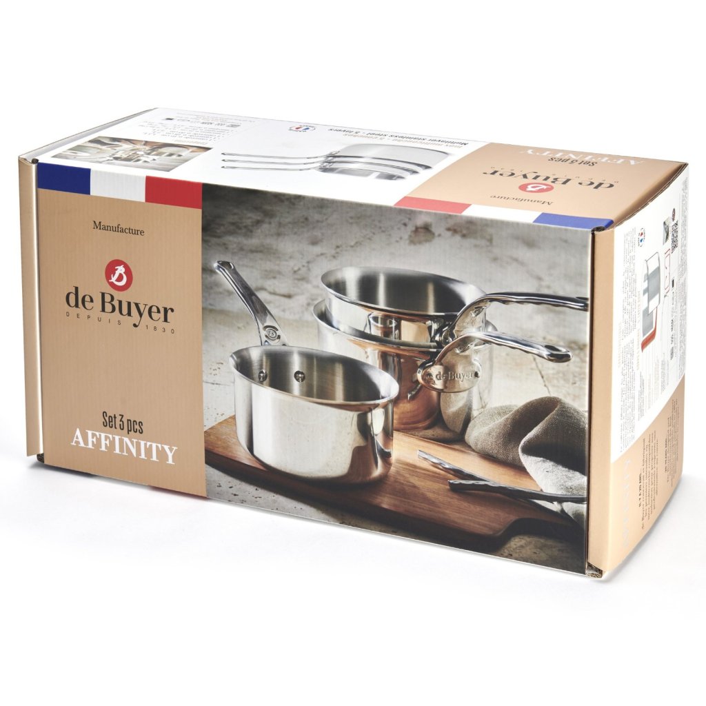 - Juego de cacerolas de acero inoxidable de Buyer AFFINITY incluye tres piezas con diámetros de 16 cm, 18 cm y 20 cm adecuadas para uso diario y profesional