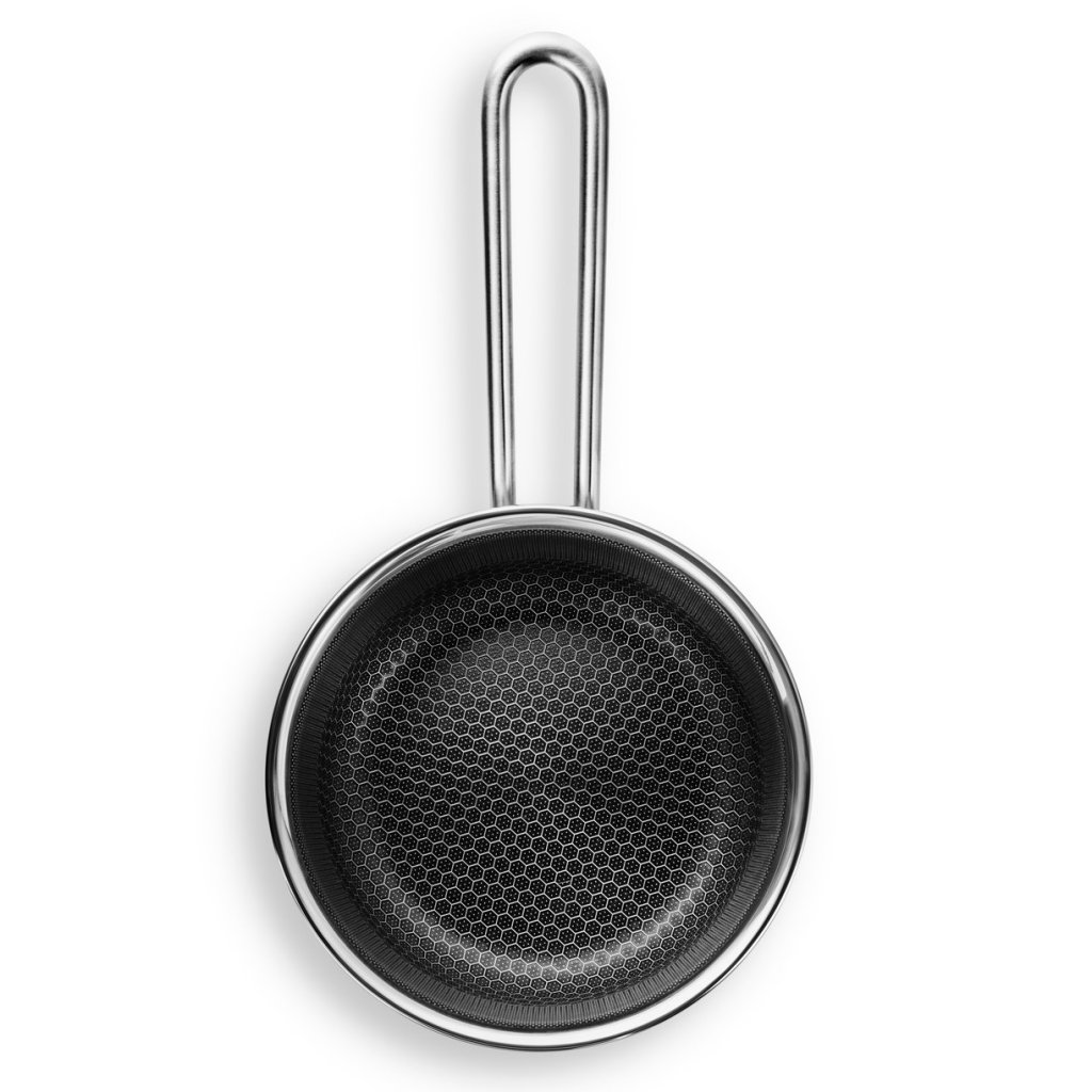 - la construcción en sándwich de varias capas garantiza un calentamiento rápido y una distribución uniforme del calor por toda la sartén