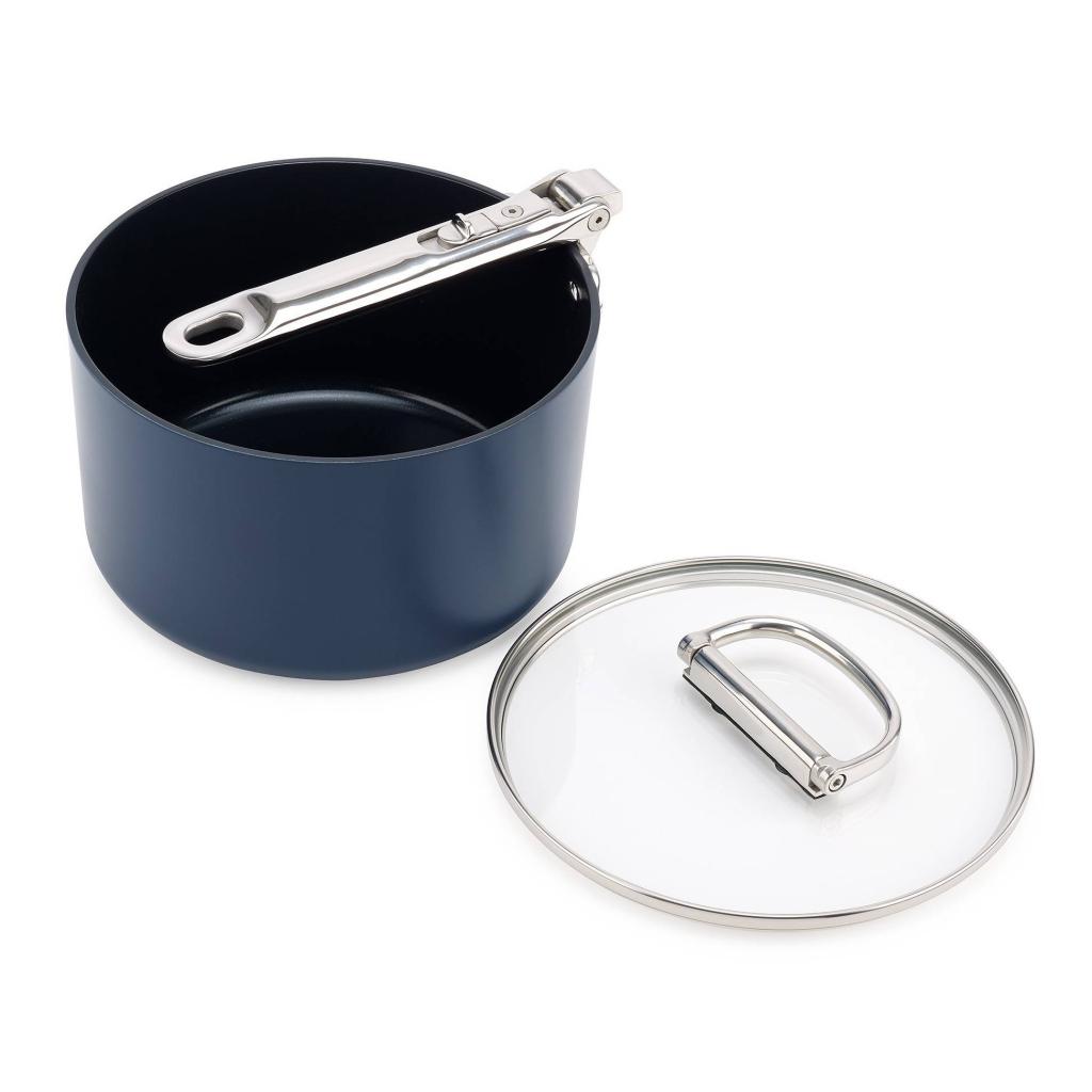 - Incluye un vidrio templado tapa para cazo con borde de acero inoxidable y un mango plegable de acero inoxidable para un almacenamiento aún más económico.