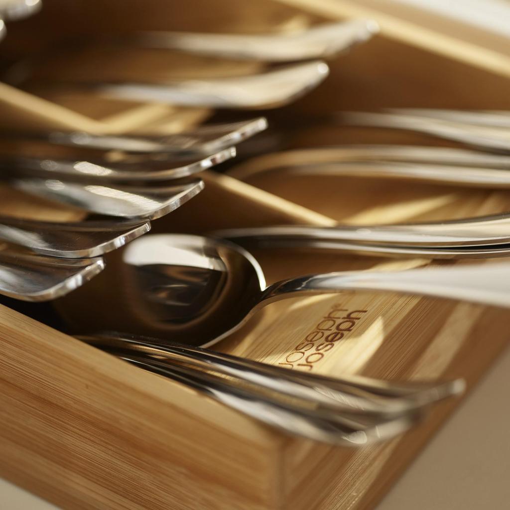 - Los compartimentos individuales están diseñados para diferentes tipos de cubiertos, por lo que las cucharas, tenedores y cuchillos tienen su propio lugar.