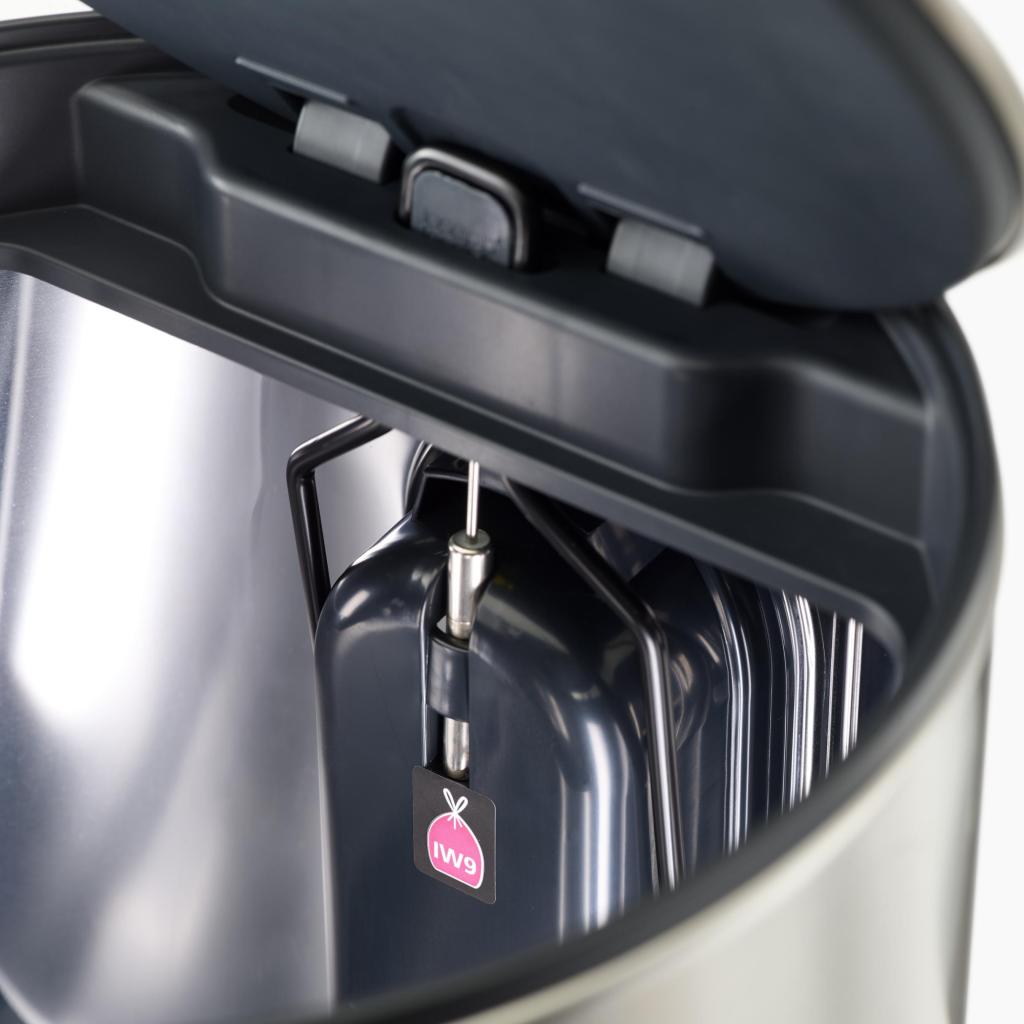 - El compartimento trasero integrado para rollos de bolsas de basura permite almacenarlas cómodamente directamente en el contenedor y reemplazarlas rápidamente en cuestión de segundos.