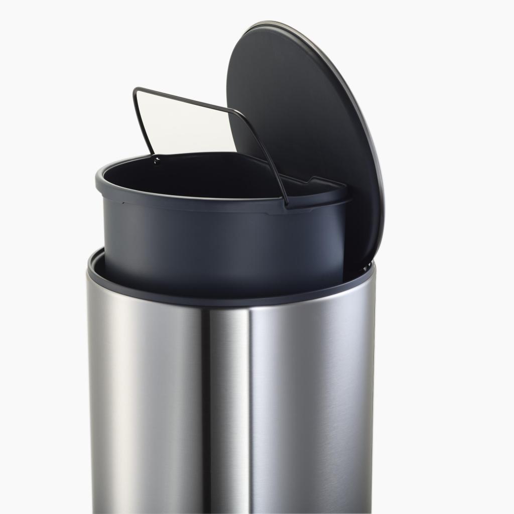 Algunos cubos intentan pasar desapercibidos. Este pasa desapercibido con tanta seguridad que te darás cuenta. El cilindro de acero inoxidable con una línea suavemente curvada parece casi un objeto de diseño que, por casualidad, ha decidido encargarse de tus residuos diarios.