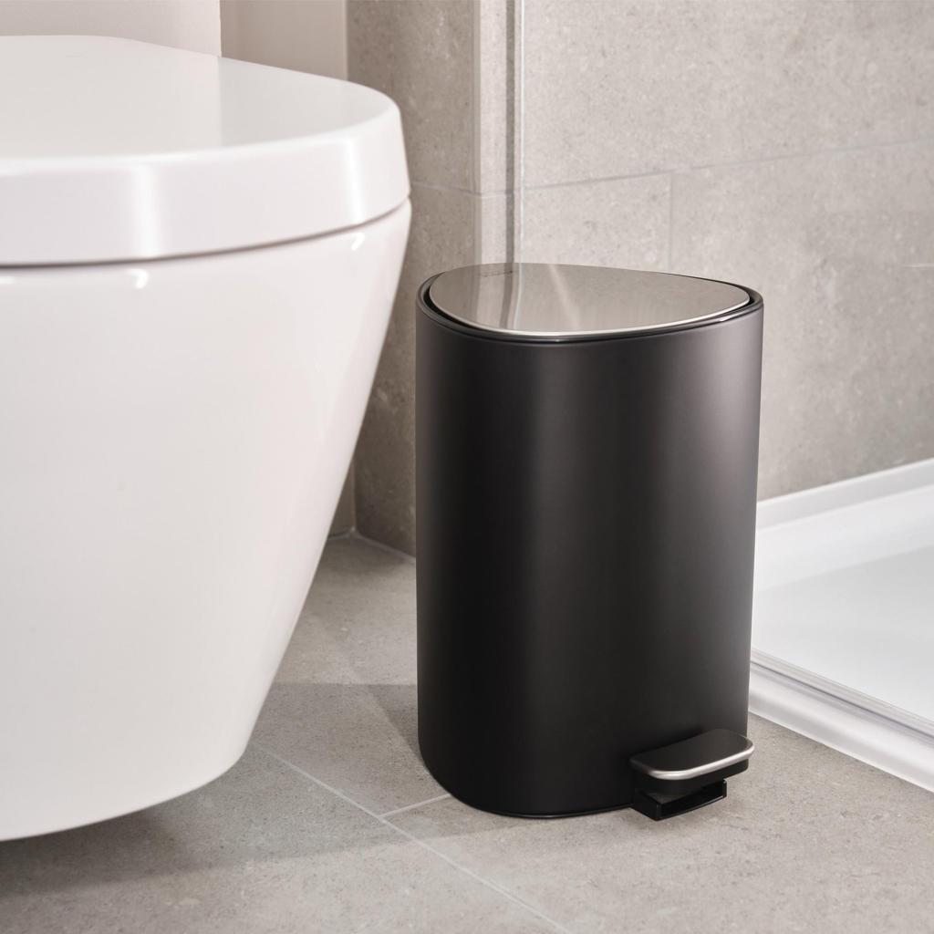 - Cubo de basura con pedal EASYSTORE de 5 litros en elegante color negro, diseñado para encajar perfectamente en la esquina de la habitación y ahorrar espacio valioso.