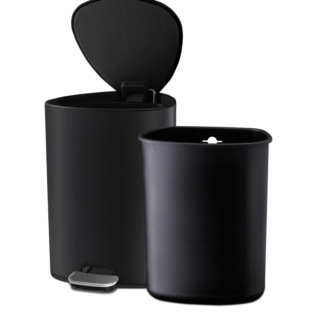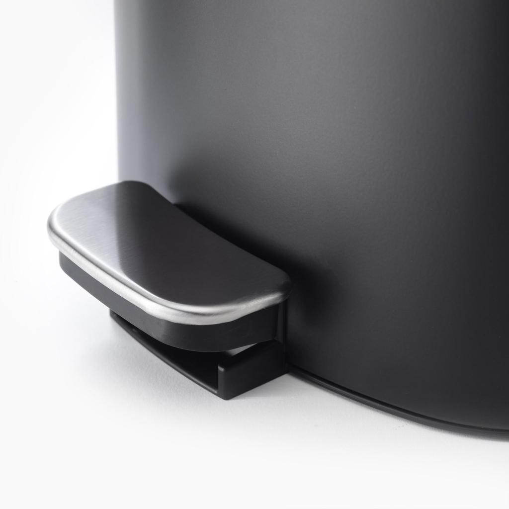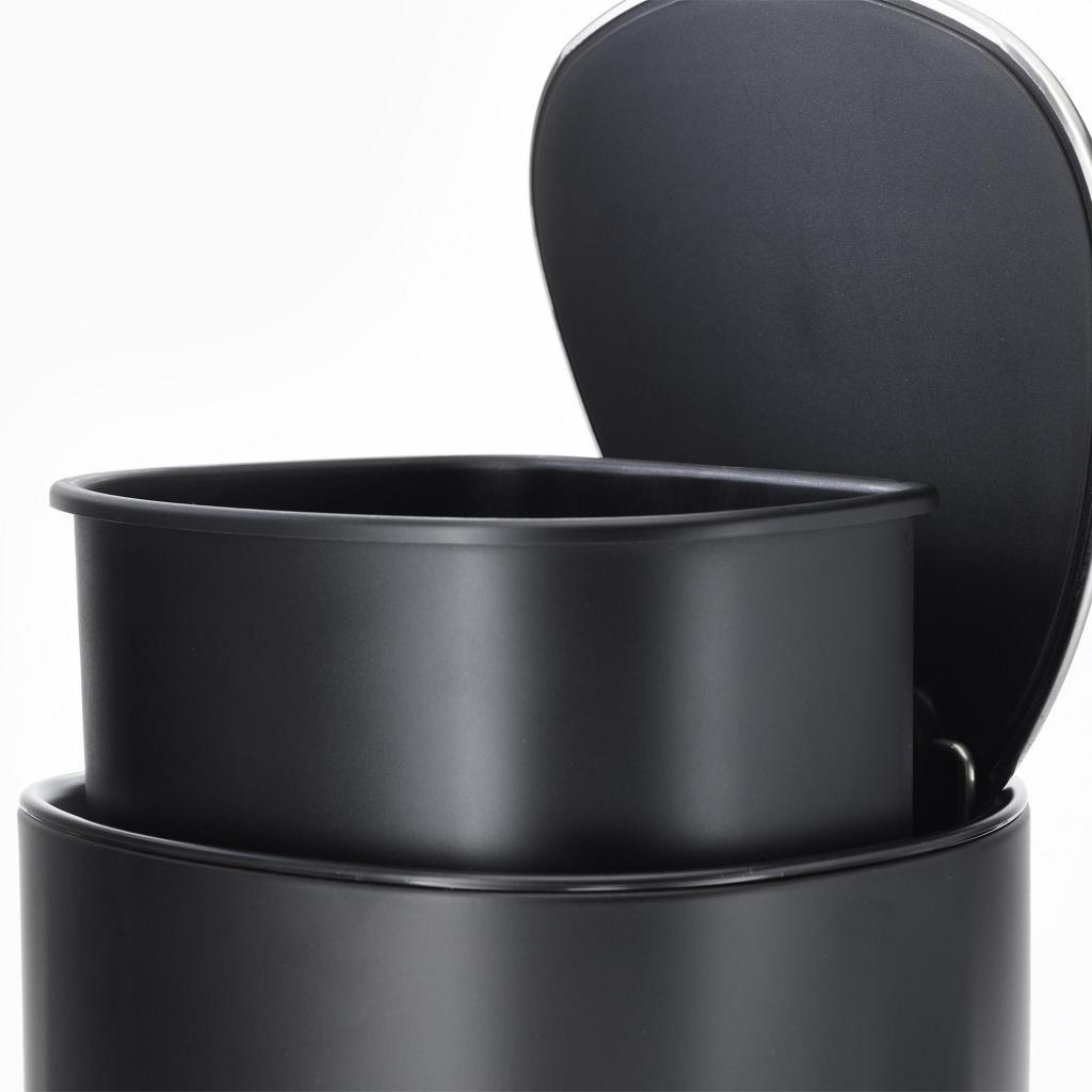 - El cuerpo del cubo está fabricado en acero resistente con un acabado negro mate y complementado con una tapa y un pedal de acero inoxidable con cierre suave.