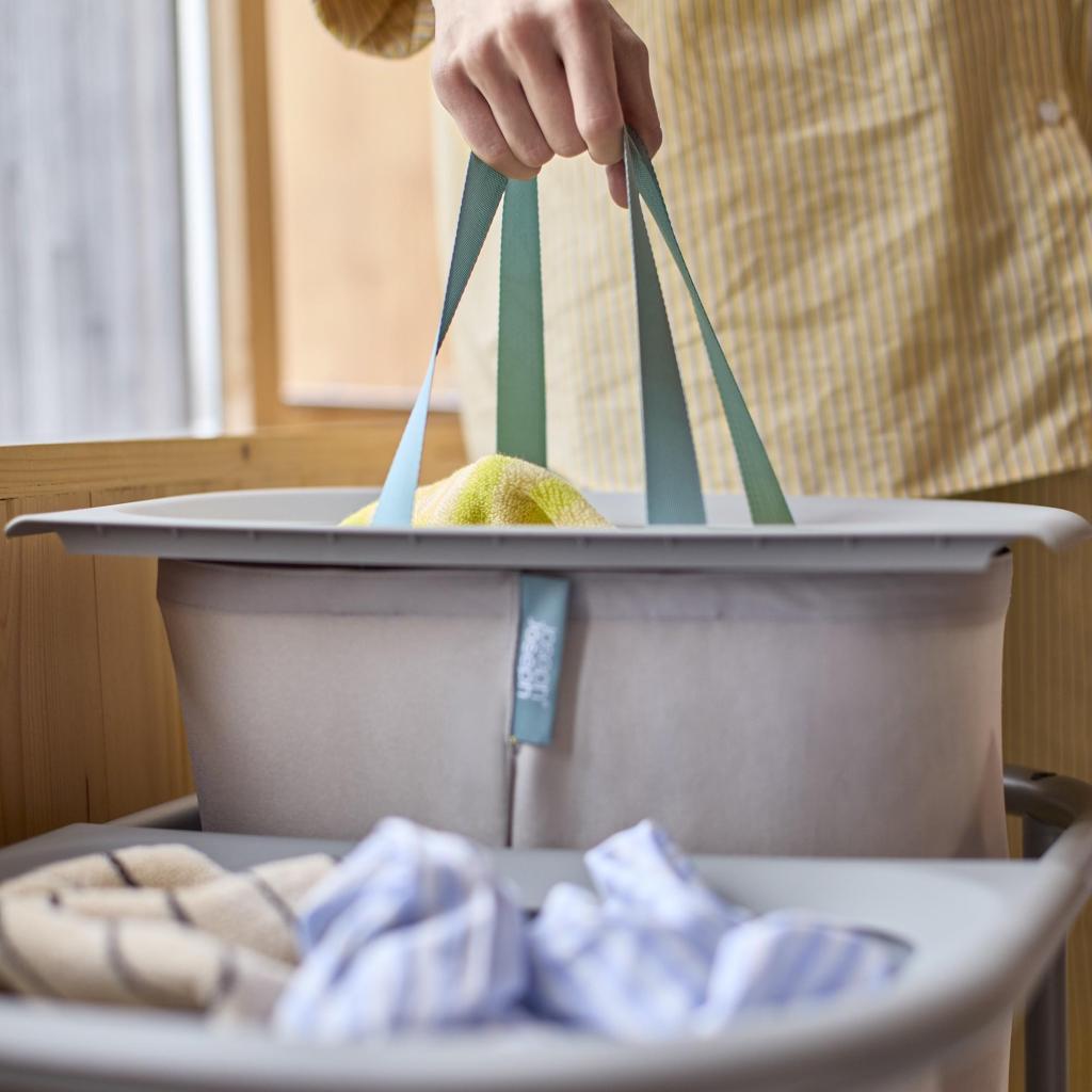 - Cada bolsa está equipada con asas textiles resistentes en un color de contraste que garantizan un agarre cómodo y un fácil transporte a la lavadora.
