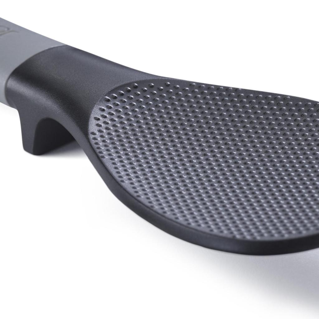 - El soporte integrado en el mango ayuda a mantener la cabeza de la cuchara alejada de la superficie de trabajo, contribuyendo a una cocina más limpia e higiénica.