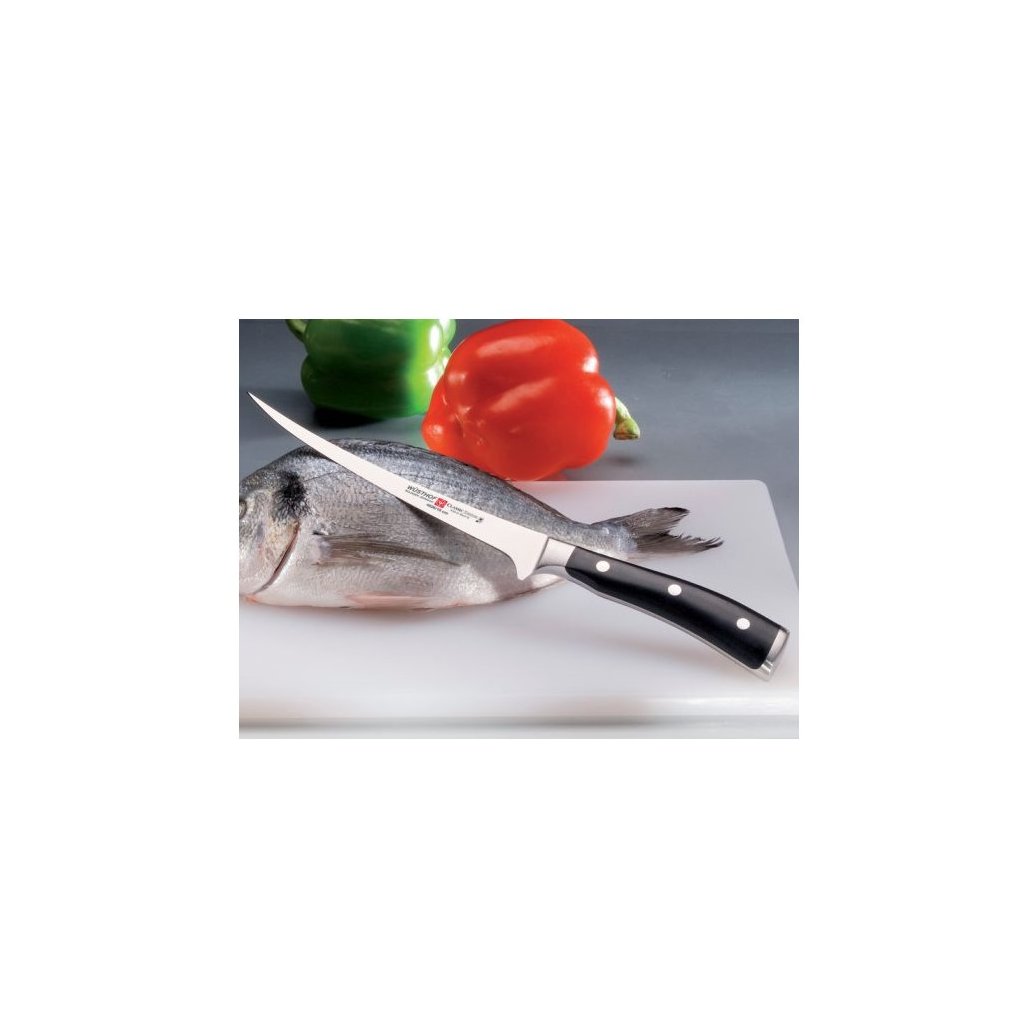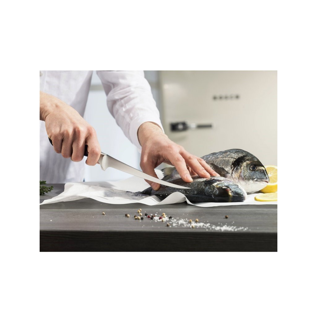 El cuchillo de filetear Classic Ikon tiene una hoja larga, delgada y sobre todo flexible con un filo recto. Es la herramienta perfecta para limpiar y filetear el pescado.