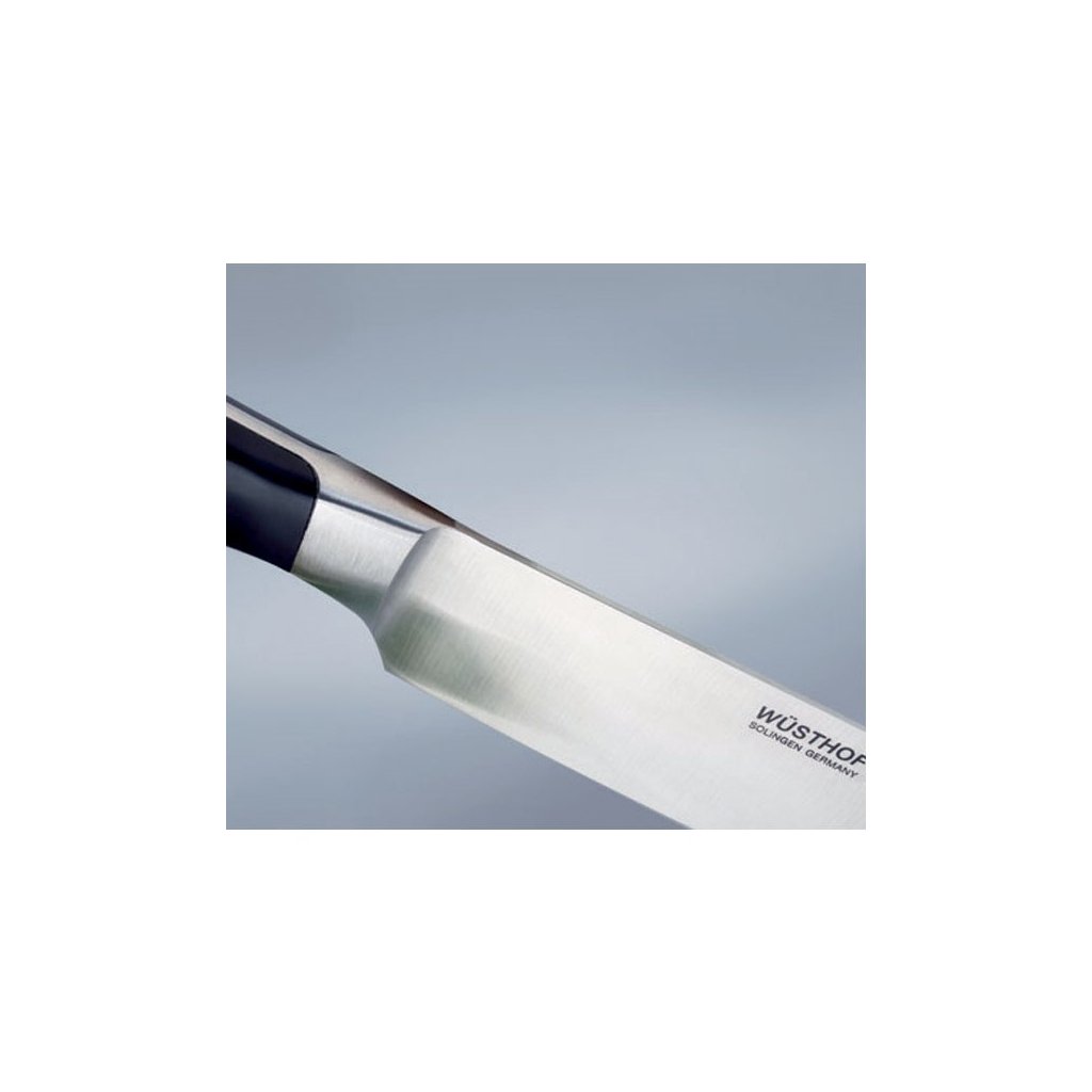 El proceso especial de afilado de cuchillos controlado por ordenador WÜSTHOF se utiliza para mantener los cuchillos perfectamente afilados. El ordenador utiliza un láser para medir la cuchilla y proporciona al robot la información que necesita para afilarla perfectamente. De este modo, la fabricación asistida por ordenador proporciona a las cuchillas un rendimiento de corte inicial extremadamente alto (en toda la longitud de la hoja) y una larga vida útil. La calidad de la hoja es alta y, lo que es importante, fácilmente recuperable.