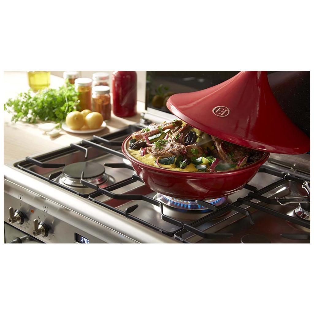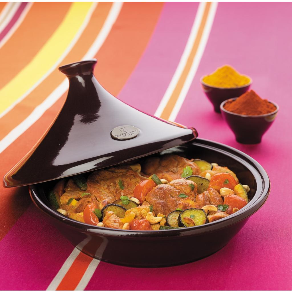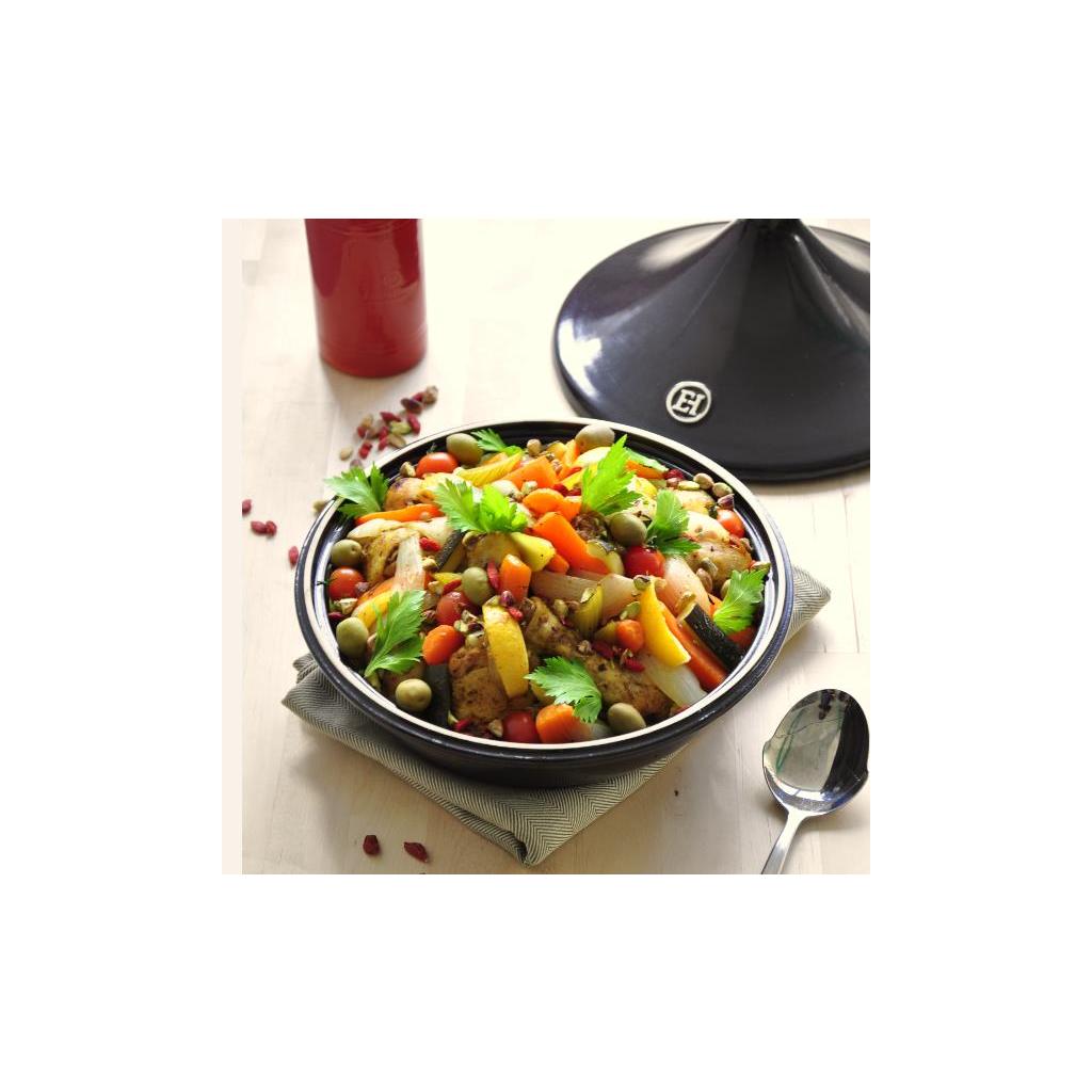 El tajine es una olla de cerámica vidriada con una tapa puntiaguda que permite que el vapor circule bien y ayuda a mantener los ingredientes tiernos y suficientemente húmedos. El recipiente puede utilizarse tanto en la cocina como en el horno. Es ideal para la preparación de tajine marroquíes, guisos y todos los platos que requieren un proceso de cocción lento para resaltar sus sabores.