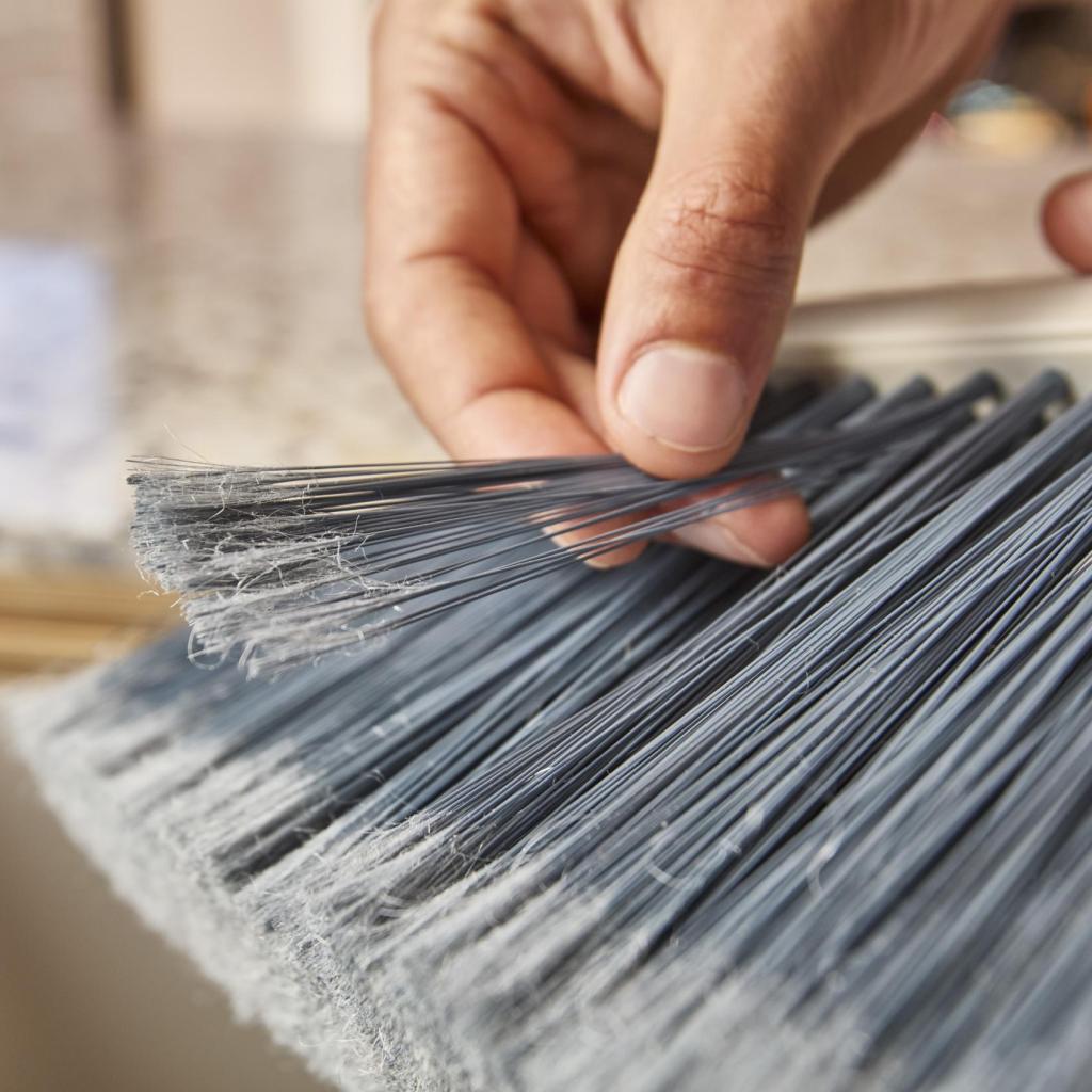 - Cerdas finas de forma especial con extremos deshilachados capturan eficazmente el polvo, las migas y la suciedad fina del piso.
