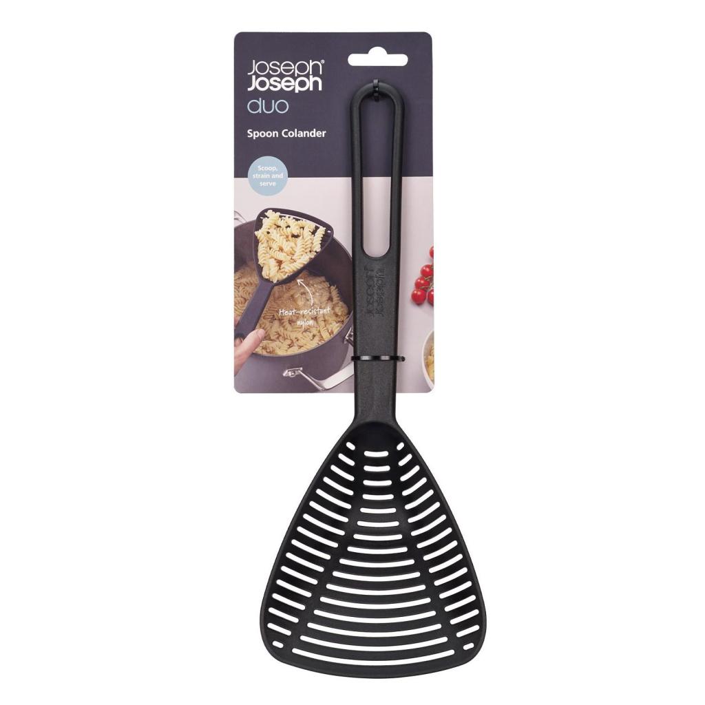 - La cuchara coladora Joseph Joseph DUO 10553 permite recoger y colar alimentos rápidamente directamente de la olla sin necesidad de escurrir agua caliente.