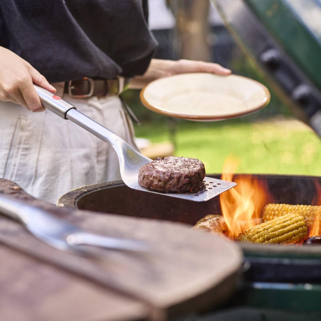 - La amplia superficie perforada permite levantar cómodamente piezas grandes de comida y garantiza estabilidad al manipularlas en la rejilla caliente.