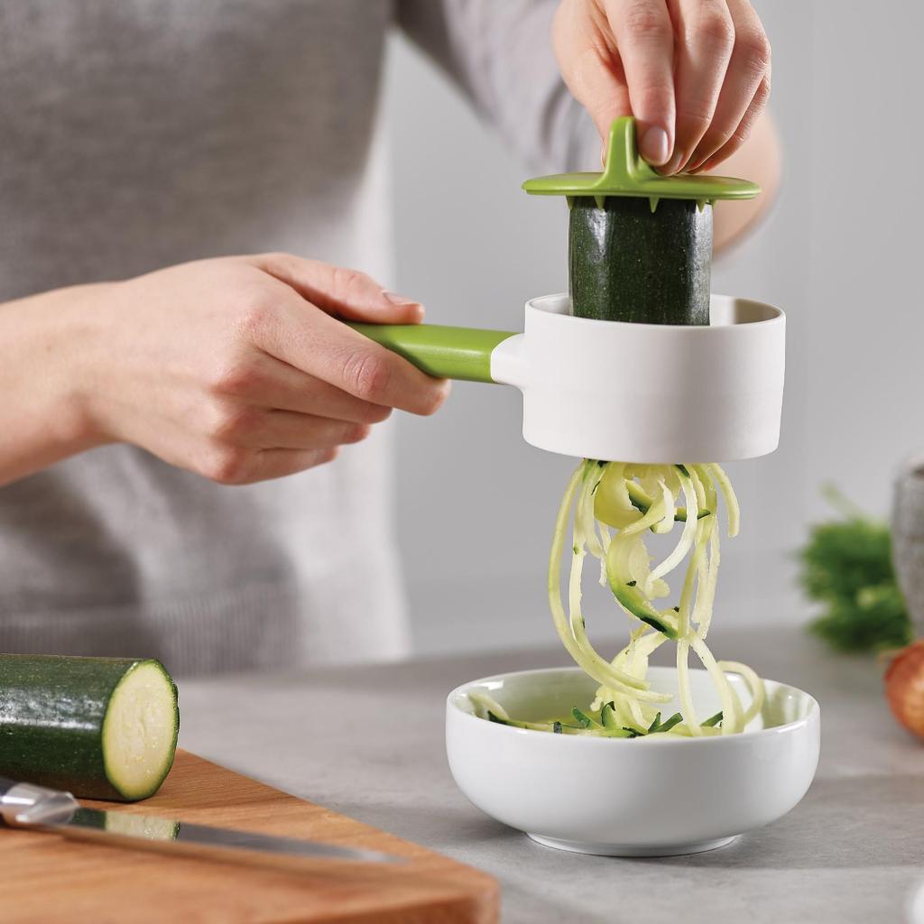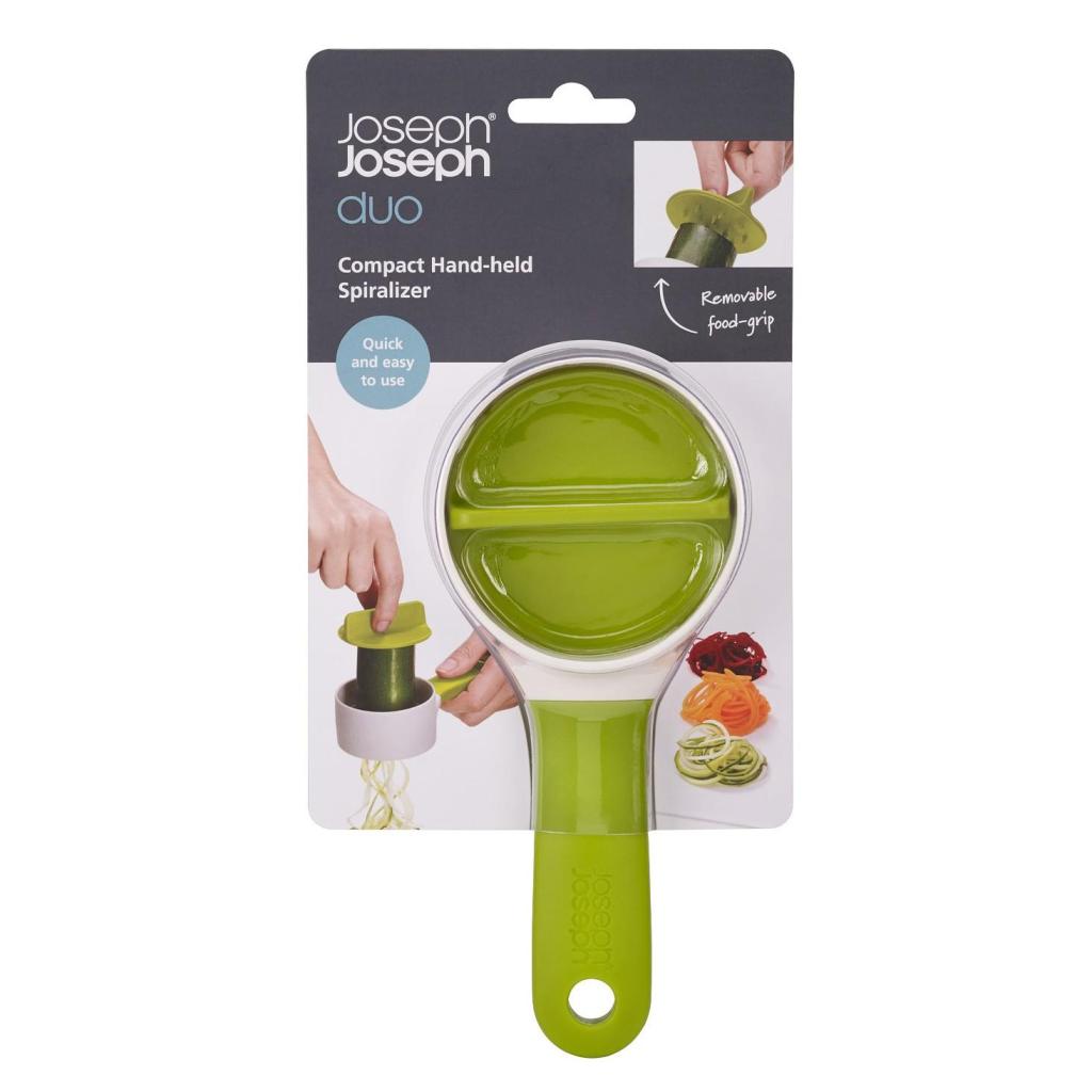 - El Espiralizador Joseph Joseph DUO COMPACT es el ayudante ideal para la preparación rápida de pequeñas cantidades de verduras directamente sobre un bol o plato.