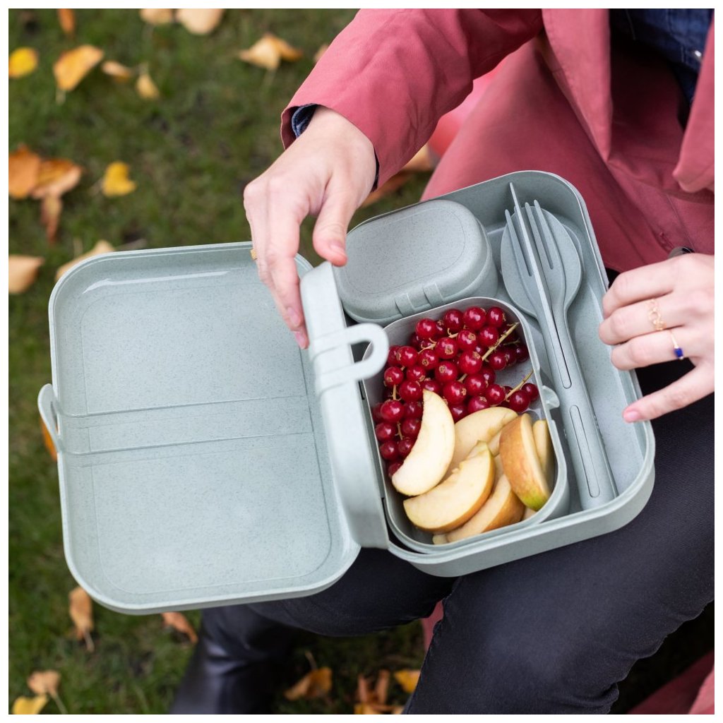 Llevar tu propia comida al trabajo o de viaje te permite reducir la cantidad de envases desechables. El juego pertenece a la gama de productos Bio de Koziol, que están fabricados con plástico y celulosa 100% reciclados y aptos para la alimentación, lo que permite ahorrar más de dos tercios de CO2 en comparación con el uso de materiales nuevos. De este modo, no sólo comes de forma saludable y ahorras algo de dinero, sino que también proteges el medio ambiente.