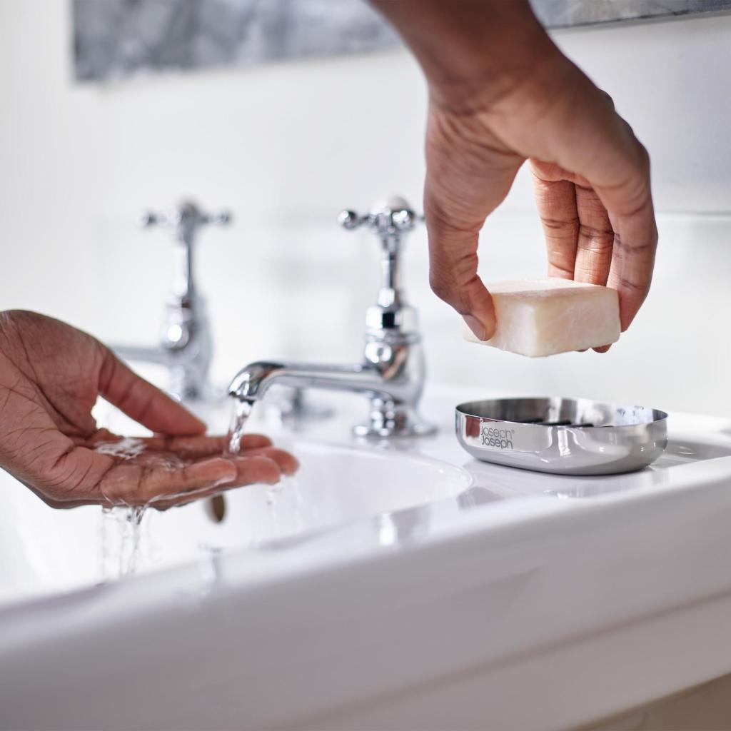 - El jabonero EASYSTORE LUXE de acero inoxidable representa una solución elegante y compacta para guardar el jabón sólido, con énfasis en la limpieza y el orden junto al lavabo.