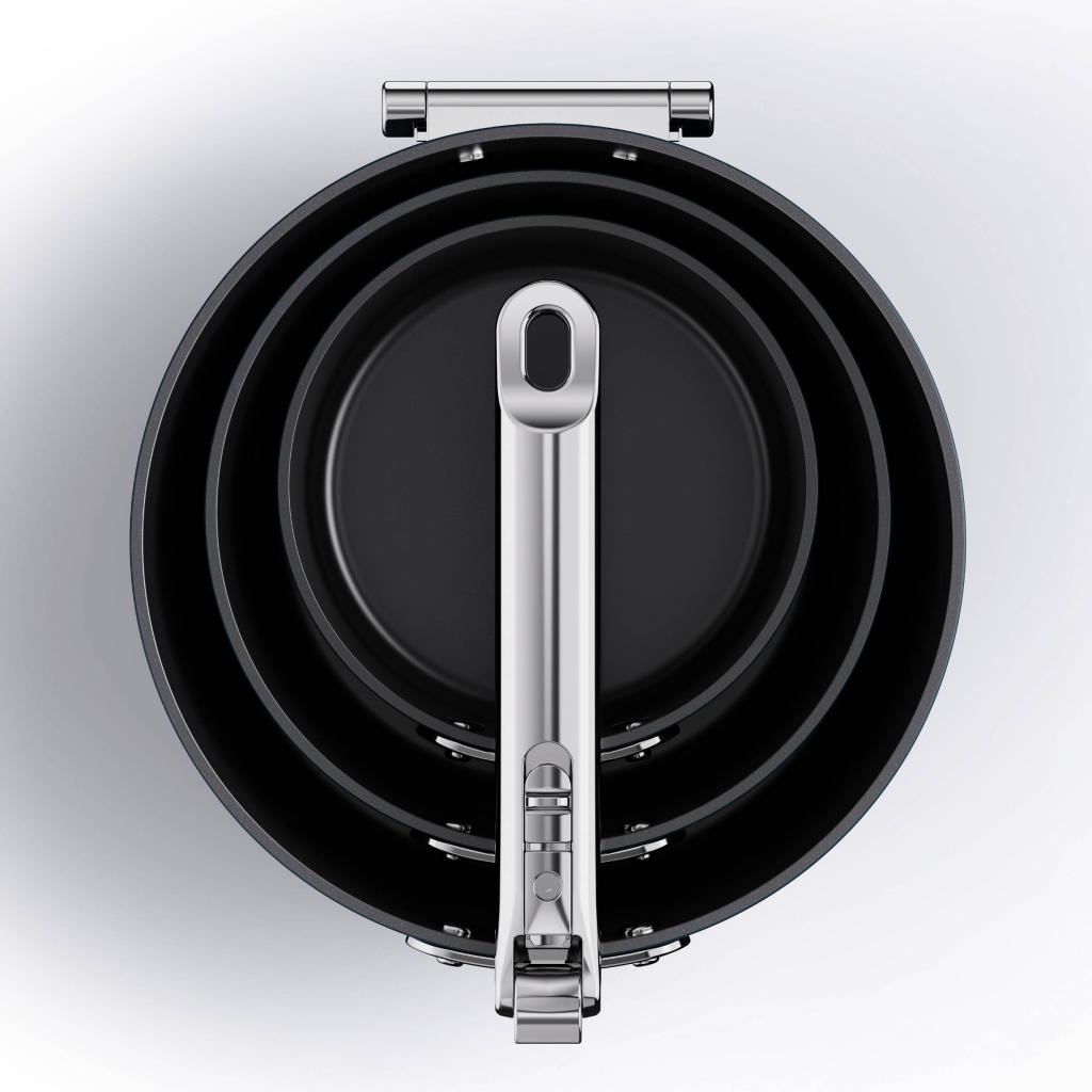 - Gracias a los mangos plegables, las cacerolas se pueden apilar fácilmente unas dentro de otras, ahorrando hasta un 50 % más de espacio de almacenamiento en comparación con las cacerolas convencionales.