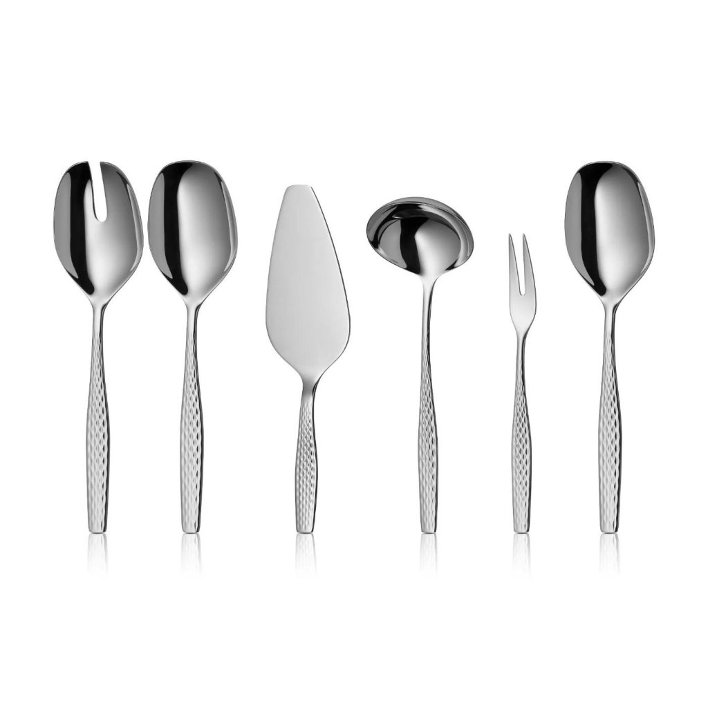 - El set incluye, entre otras cosas, cuchara para servir, horquilla, cucharón y servidor de tartas, por lo que no tendrás que comprar nada más.