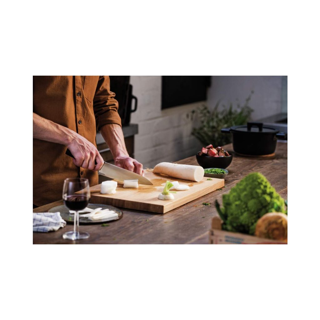 - El versátil cuchillo de cocinero de gran tamaño, con una hoja de 20 cm de longitud y un filo recto y perfectamente afilado, es ideal para cortar grandes trozos de comida: corta carne, verduras e incluso hierbas picadas.