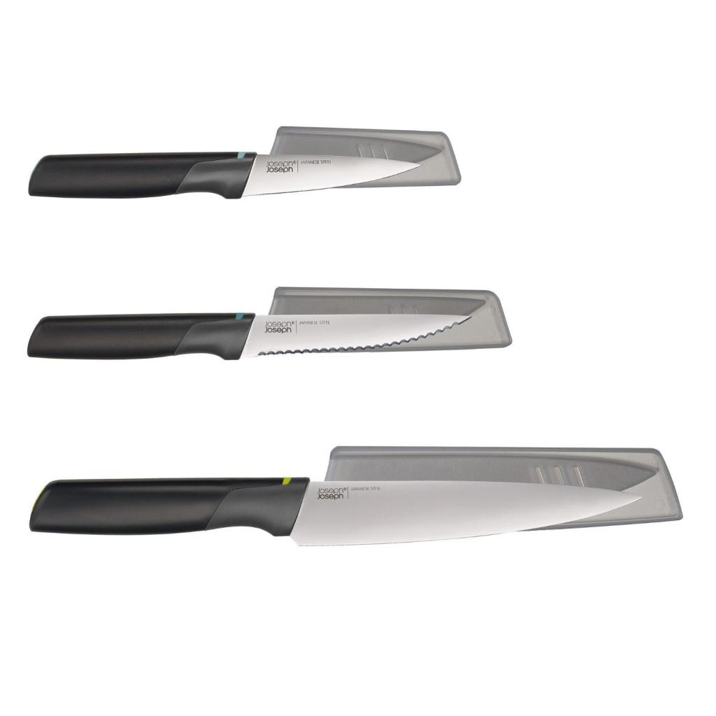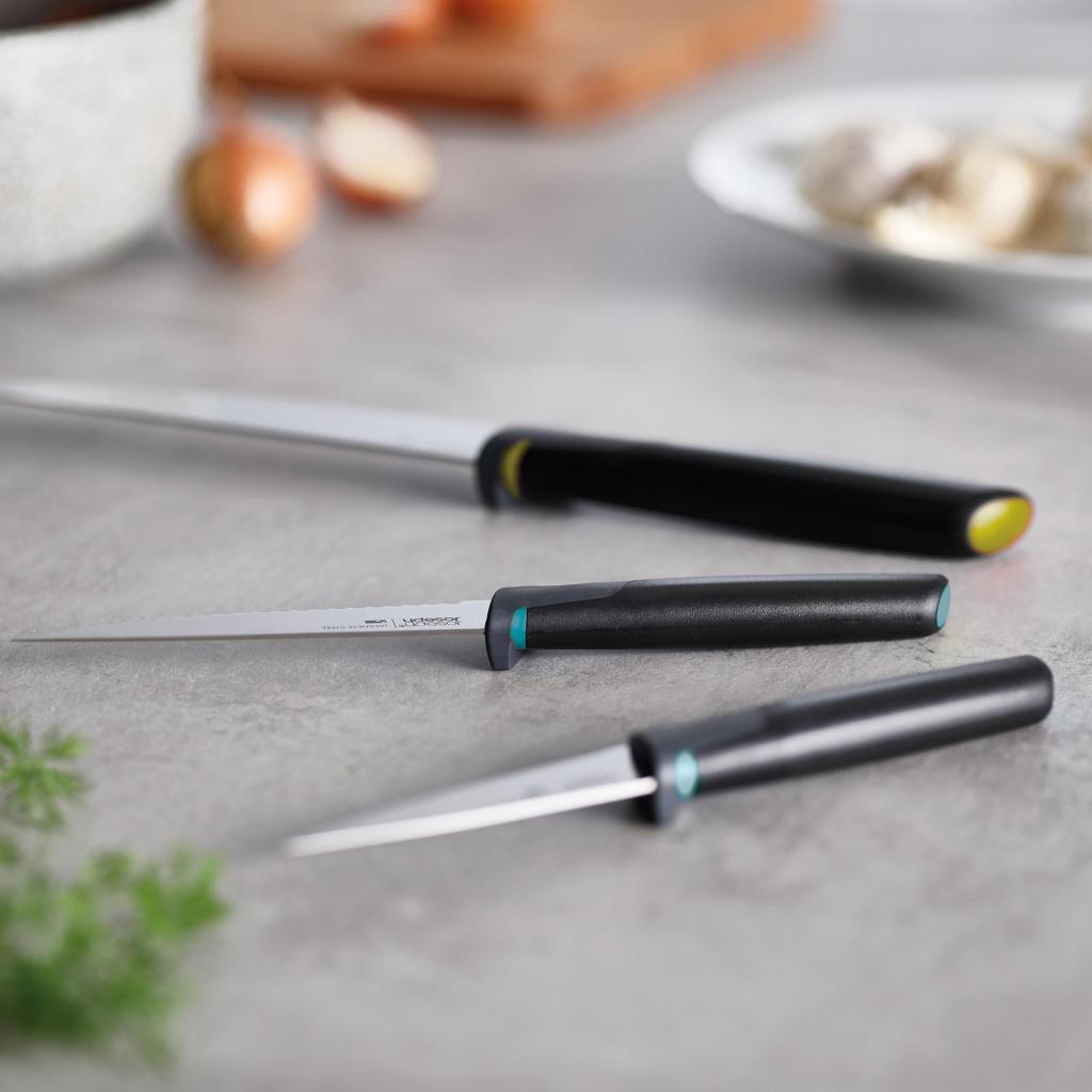 - El juego de cuchillos de cocina Joseph Joseph ELEVATE OPAL contiene 3 prácticos cuchillos diseñados para el trabajo diario en la cocina, desde cortar verduras hasta preparar carne.