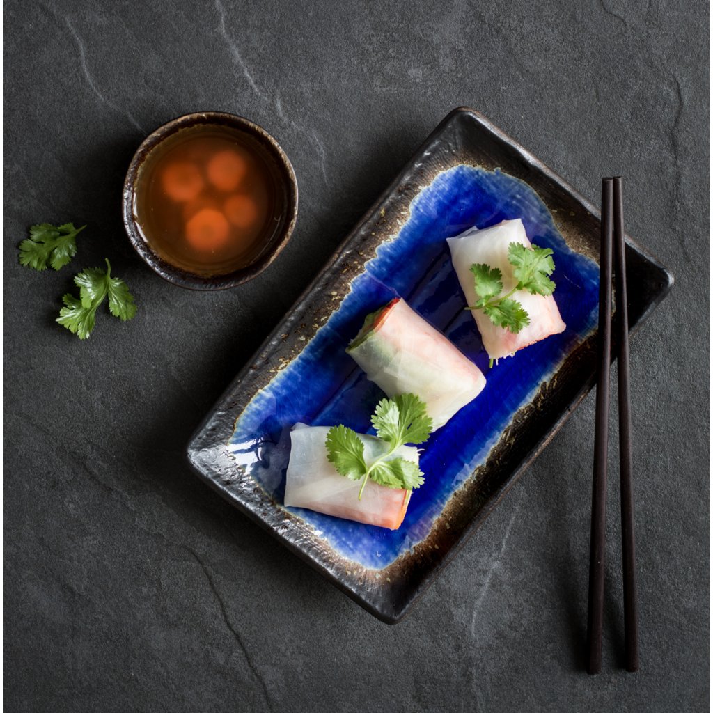 El plato de sushi rectangular de la colección Cobalt Blue by MIJ está hecho a mano con cerámica natural duradera que no contiene impurezas dañinas ni metales pesados. Está elaborado por maestros japoneses cuya tradición se remonta al siglo XII. Las pinturas son de alta calidad, no se despegan y tampoco contienen sustancias nocivas.