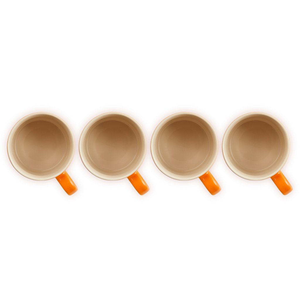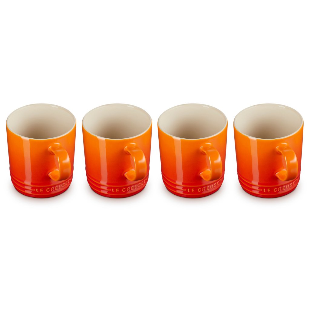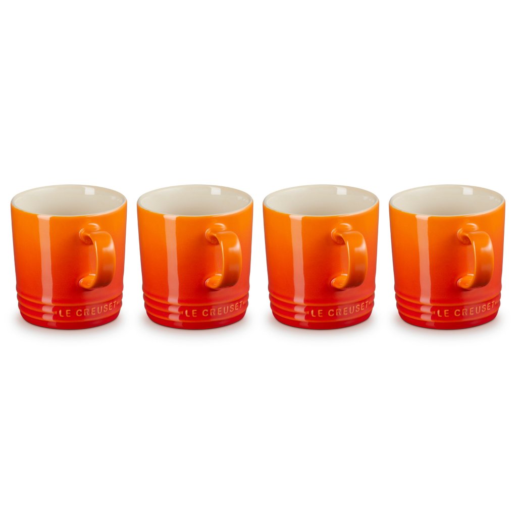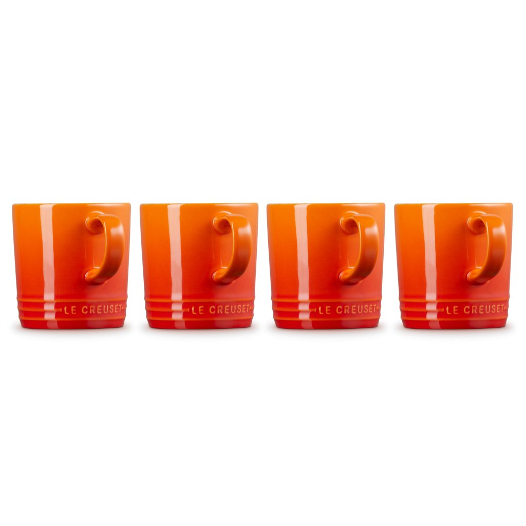- El juego de 4 tazas de cerámica Le Creuset en el icónico tono FLAME es un verdadero símbolo de la marca: la cálida combinación de naranja y rojo evoca la energía de la lava caliente y aporta una chispa radiante de optimismo a cada día.