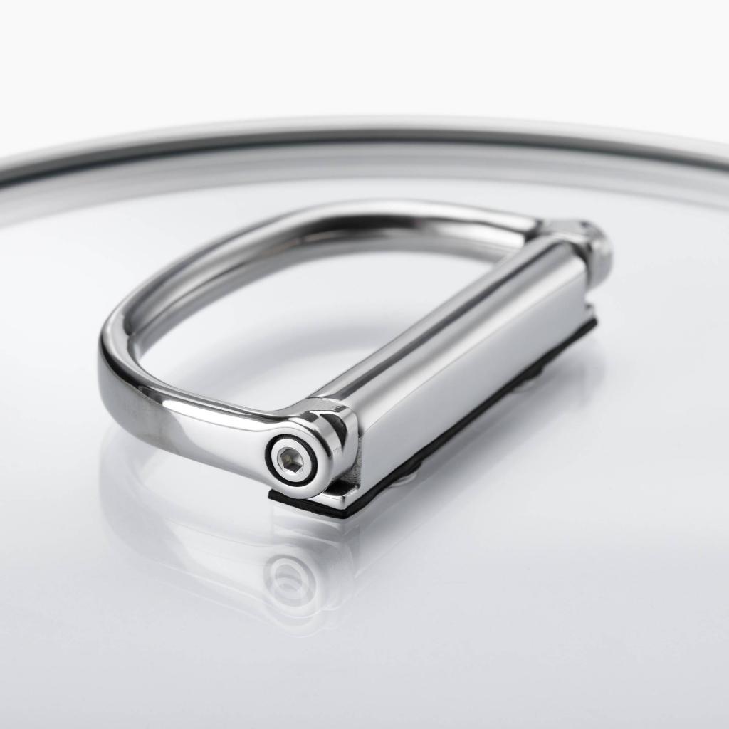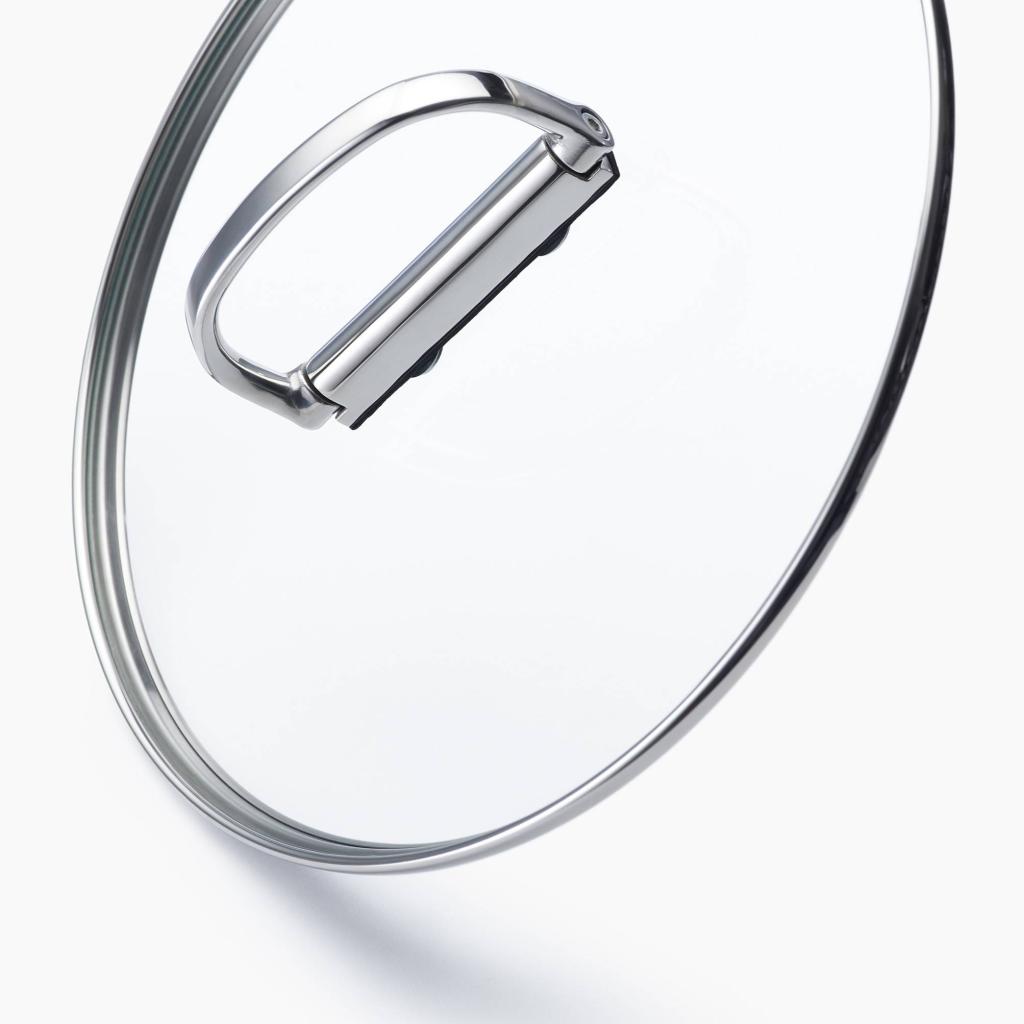 - Incluye un vidrio templado tapa para cazo con borde de acero inoxidable y un mango plegable de acero inoxidable para un almacenamiento compacto y transparente.