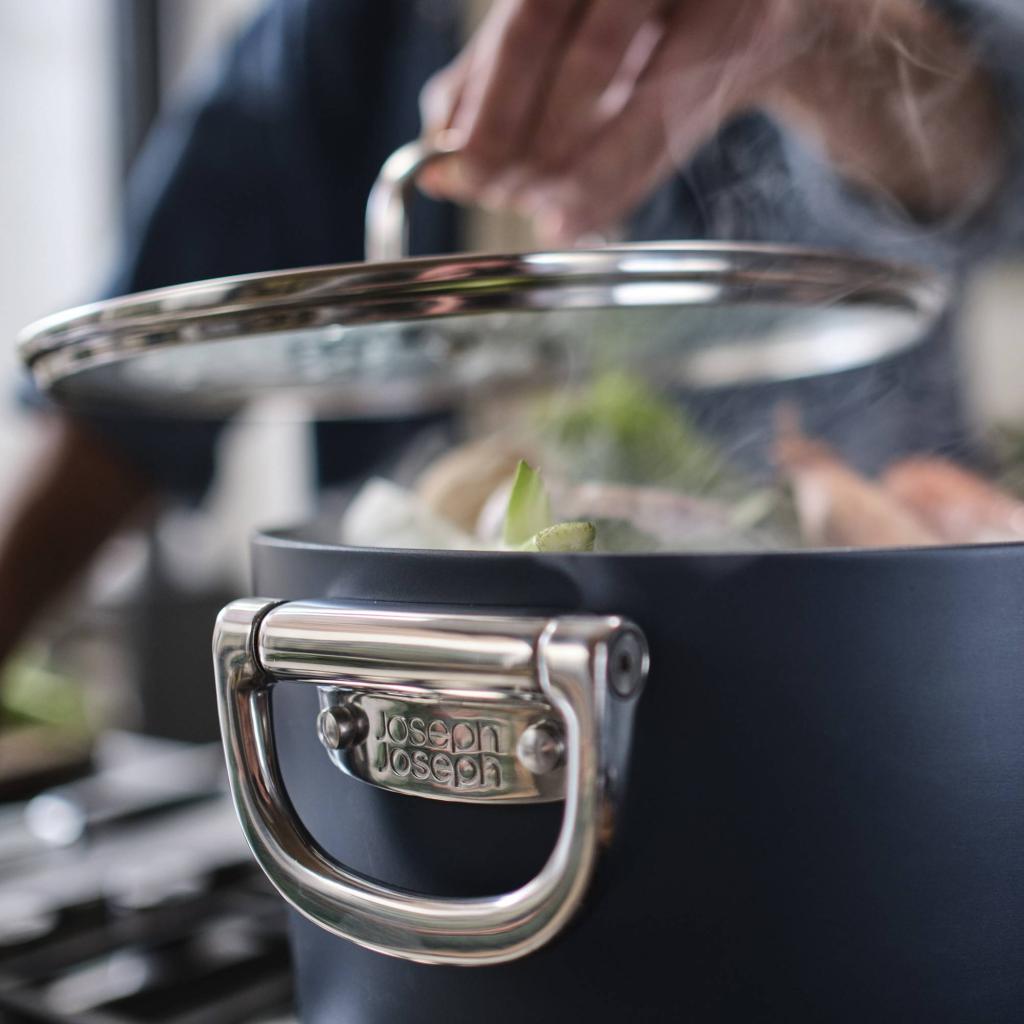 Batería de cocina que entiende las realidades de la cocina moderna - Joseph Joseph SPACE. Durante la cocción, se mantiene firme y seguro, listo para manejar todo, desde un desayuno rápido hasta una cena improvisada. Pero cuando llega el momento de guardar, cambia de carácter y se adapta discretamente al espacio, sin reclamar más sitio del estrictamente necesario. ¿Qué más se puede pedir?