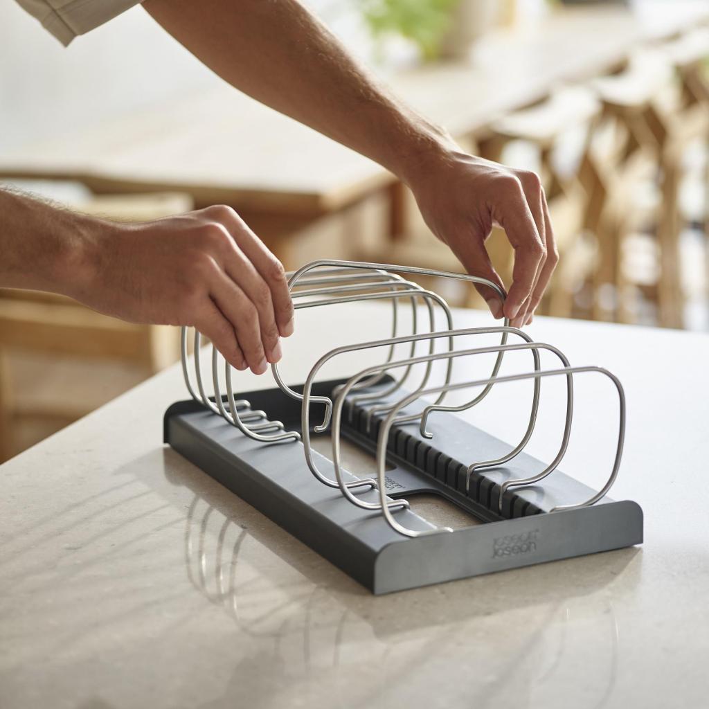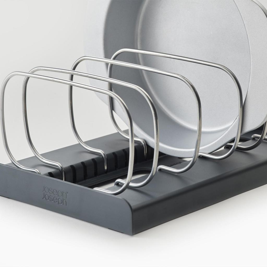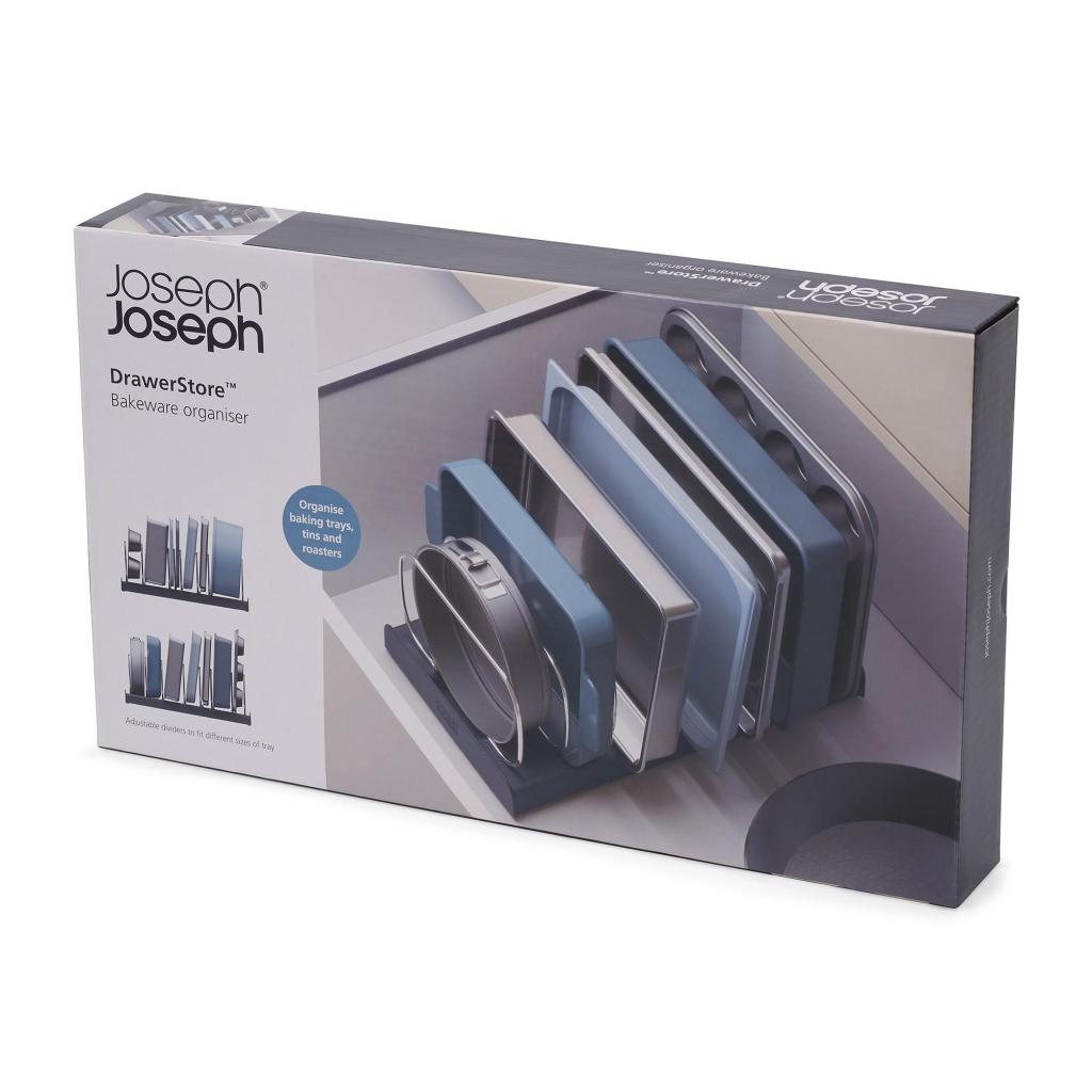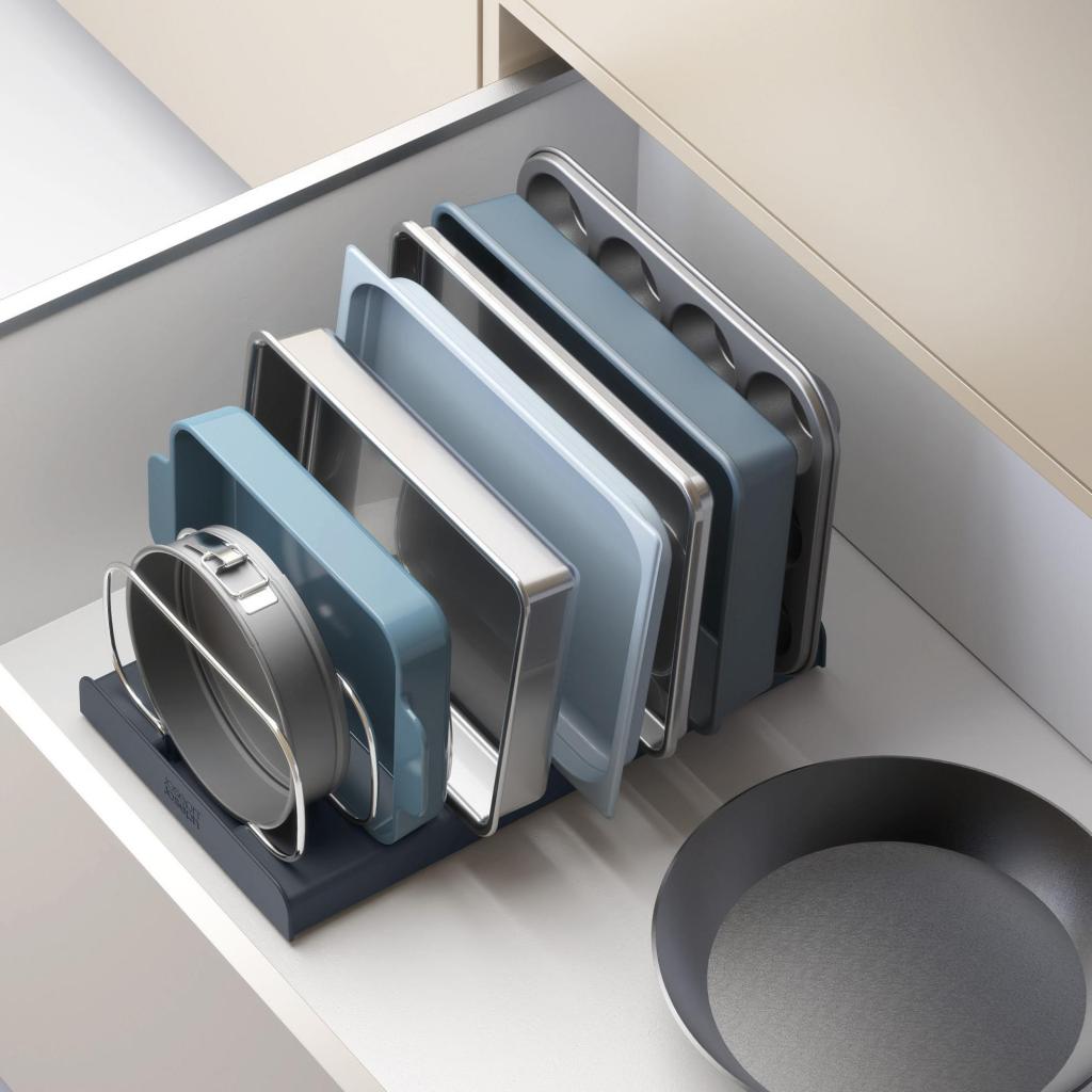 - El organizador de moldes para hornear Joseph Joseph DRAWERSTORE ayuda a organizar de forma clara los moldes para hornear, las bandejas y los moldes para pasteles en el cajón de la cocina.
