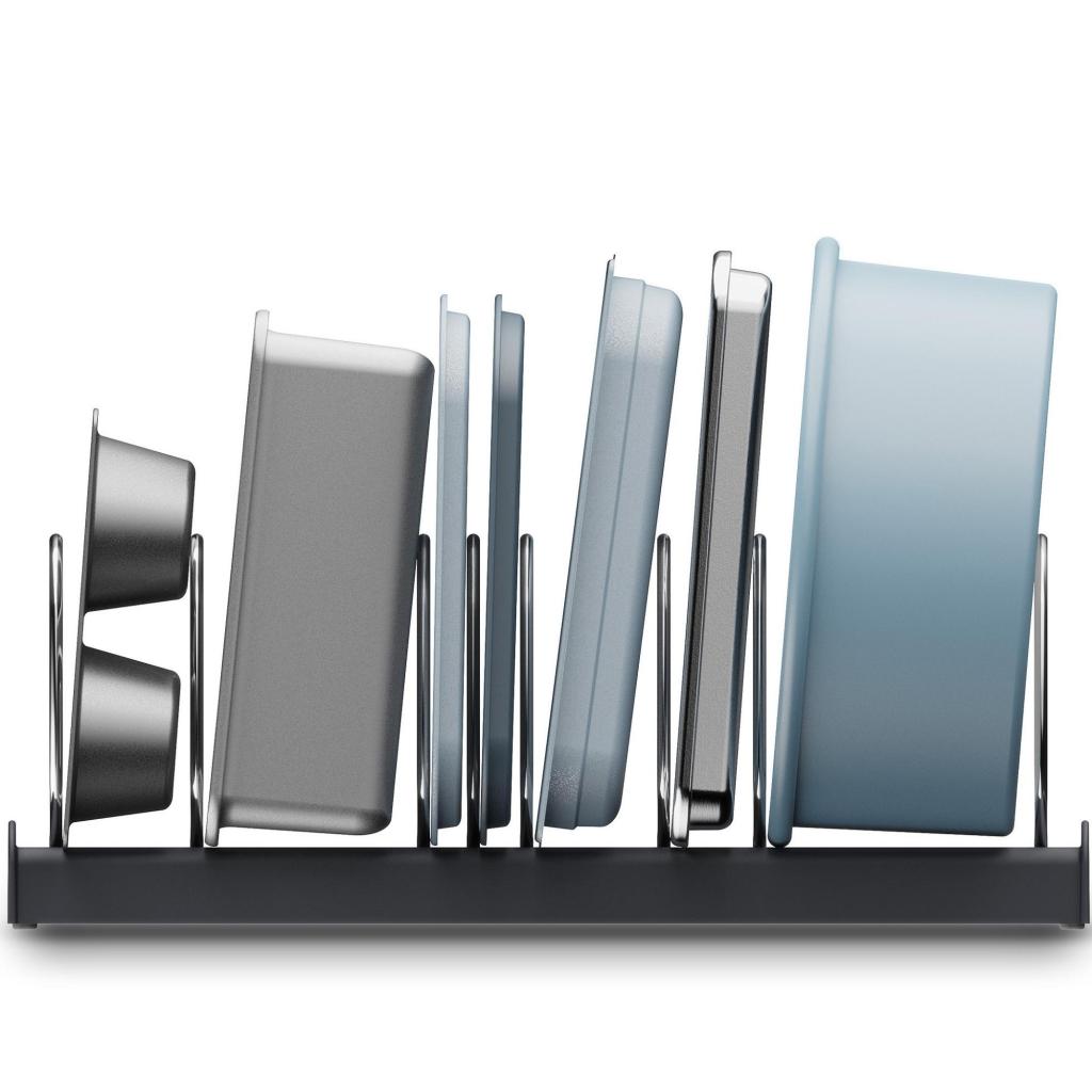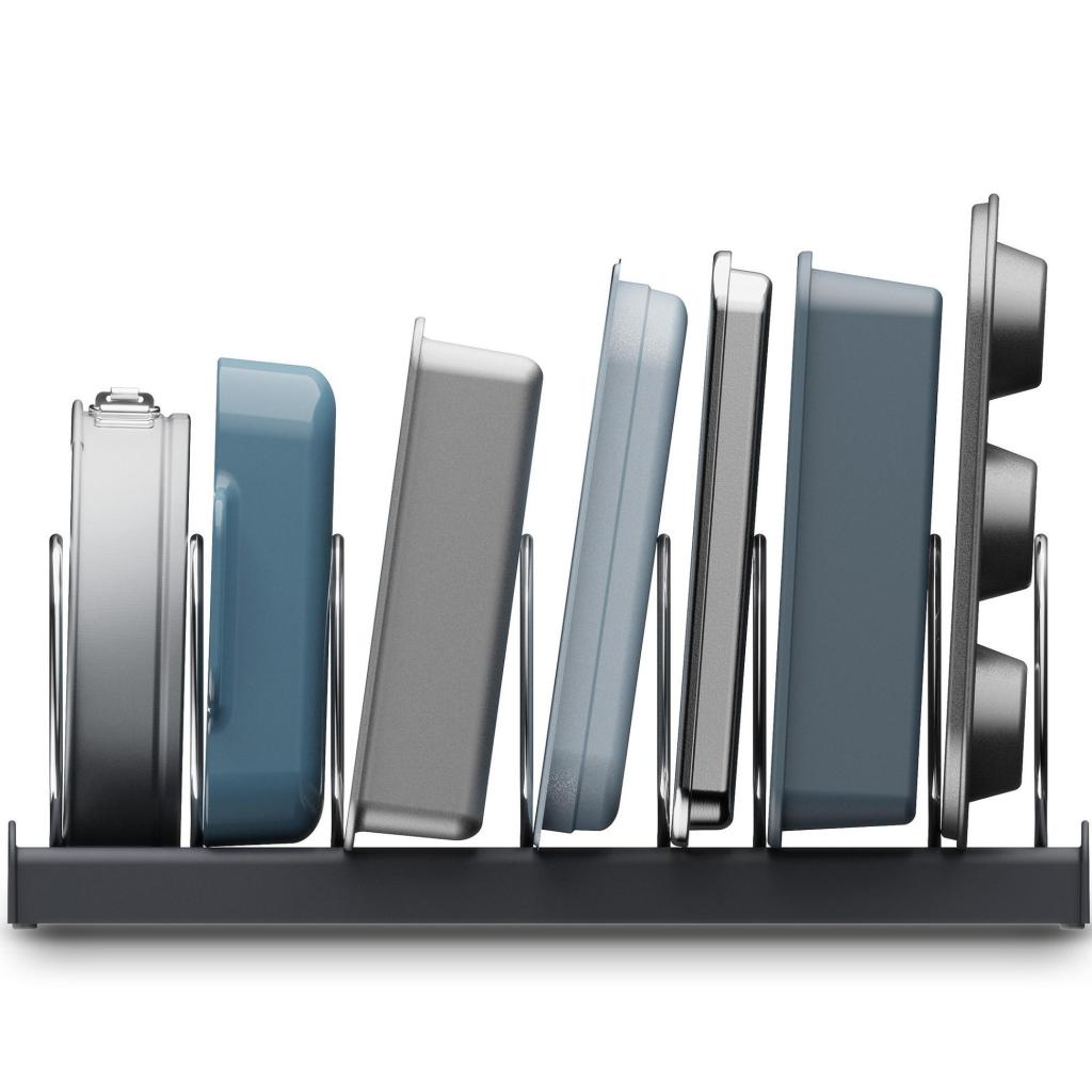 - Una solución práctica para cualquier cocina que desee tener bandejas para hornear, fuentes y moldes para pasteles siempre bien organizados.