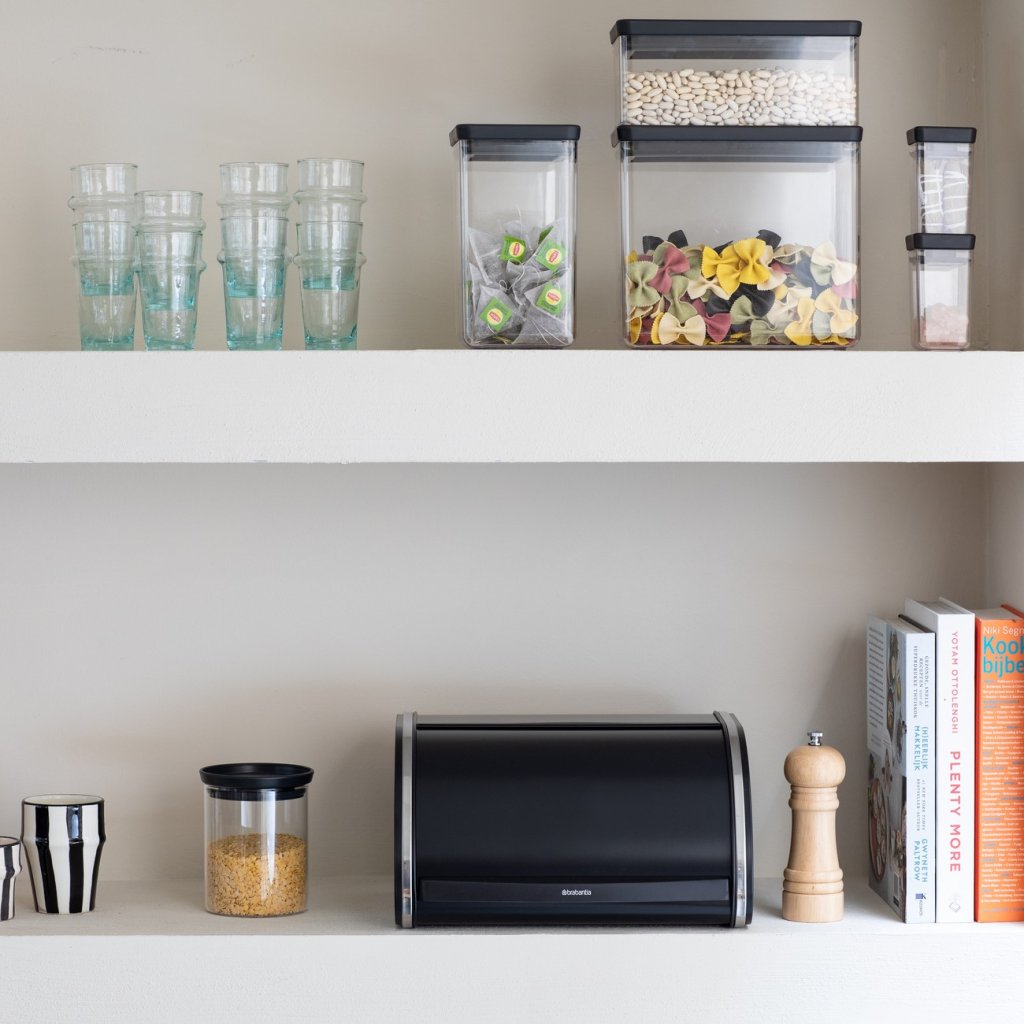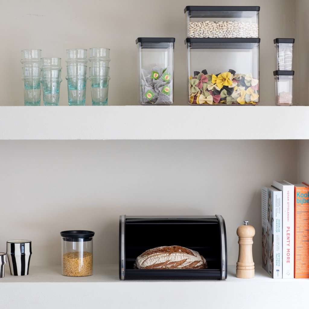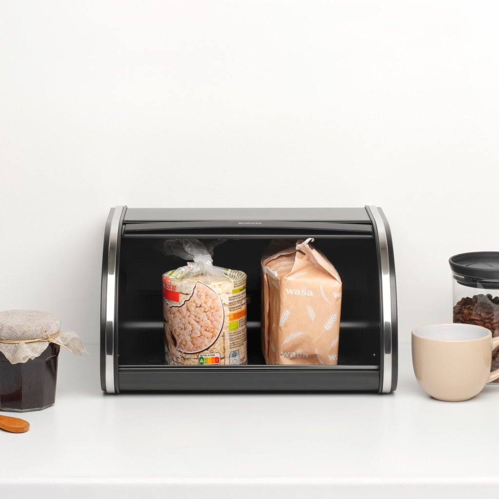 - Práctico panera Brabantia ROLL El TOP en elegante negro es la solución ideal para guardar dos barras de pan u otros pasteles.