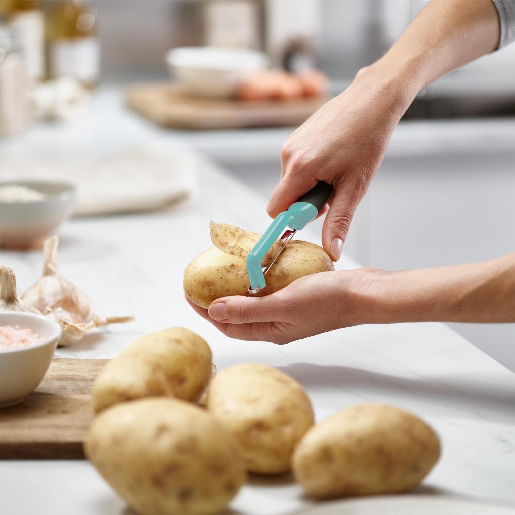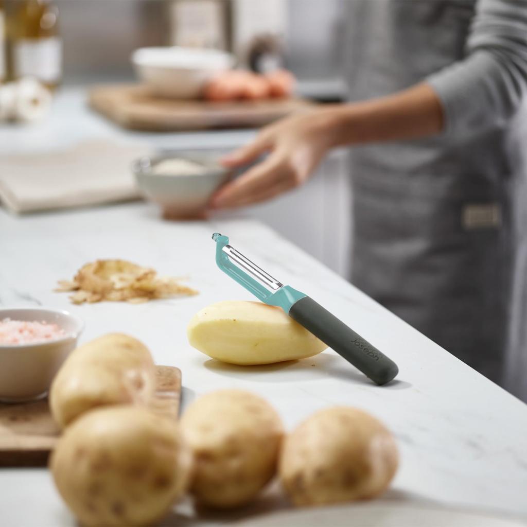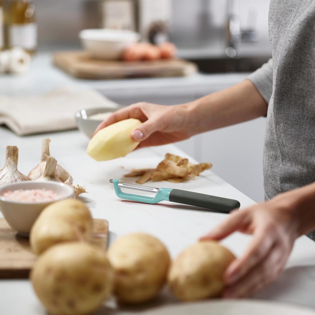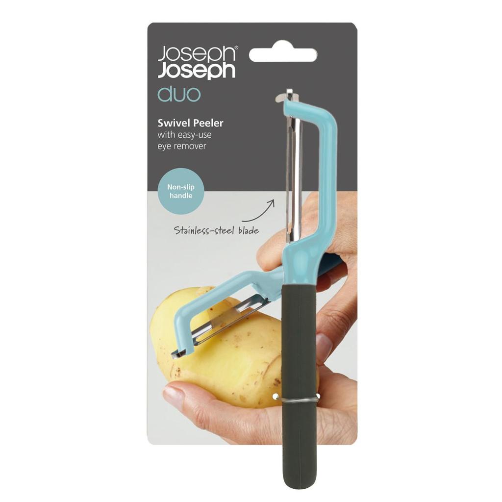 - El pelador Joseph Joseph DUO con hoja oscilante es un ayudante práctico para pelar a diario patatas, verduras y frutas, que te facilitará la preparación de ingredientes y hará más agradable el tiempo que pases en la cocina.