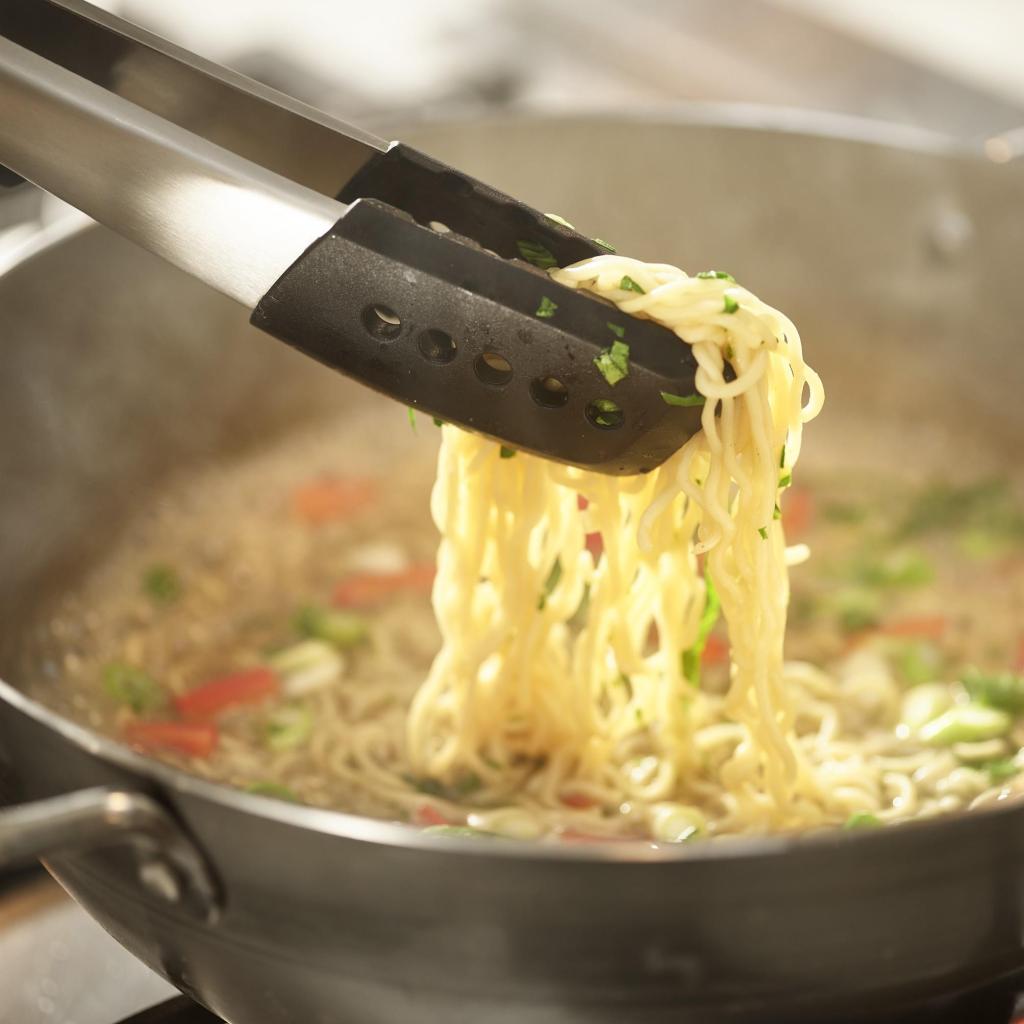 - Las pinzas grandes proporcionan un agarre firme al voltear carne, verduras u otros alimentos voluminosos que se preparan en la sartén o a la parrilla.