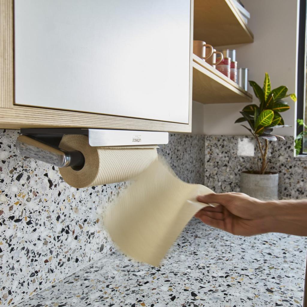 - El soporte está diseñado para que el rollo permanezca de fácil acceso sin estorbar mientras se trabaja en la encimera de la cocina.