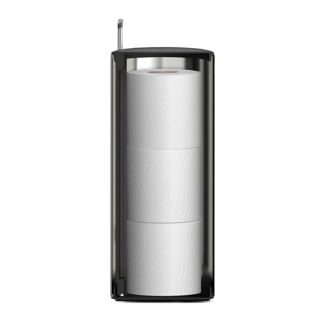 - El diseño alto y cerrado permite almacenar hasta 3 rollos de papel higiénico de repuesto, que permanecen protegidos y discretamente ocultos a la vista.
