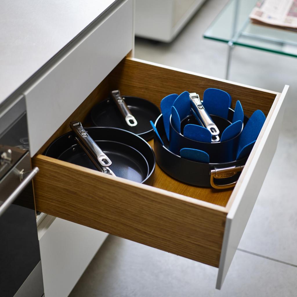 - La estructura suave pero firme del material crea una capa protectora entre las sartenes y ollas individuales apiladas unas dentro de otras.
