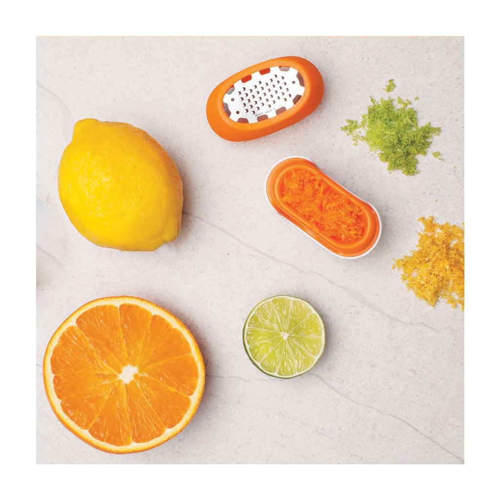 El nuevo rallador compacto de pieles de cítricos Flexi Zesti ha sido diseñado con un diseño fresco y juvenil que combina materiales modernos y colores jugosos. Los dientes, muy afilados y finos, desprenden fácil y rápidamente la cáscara superior de los cítricos, que se recoge cómodamente en la pequeña tolva. Dado que la marca americana Microplane® es conocida por la máxima nitidez de sus productos, durante la preparación de los alimentos no se produce ningún tipo de trituración o daño en los ingredientes procesados y el resultado final es de máximo sabor y aroma.