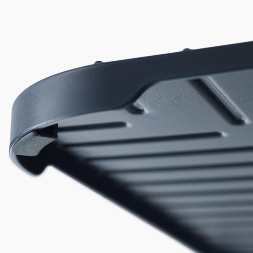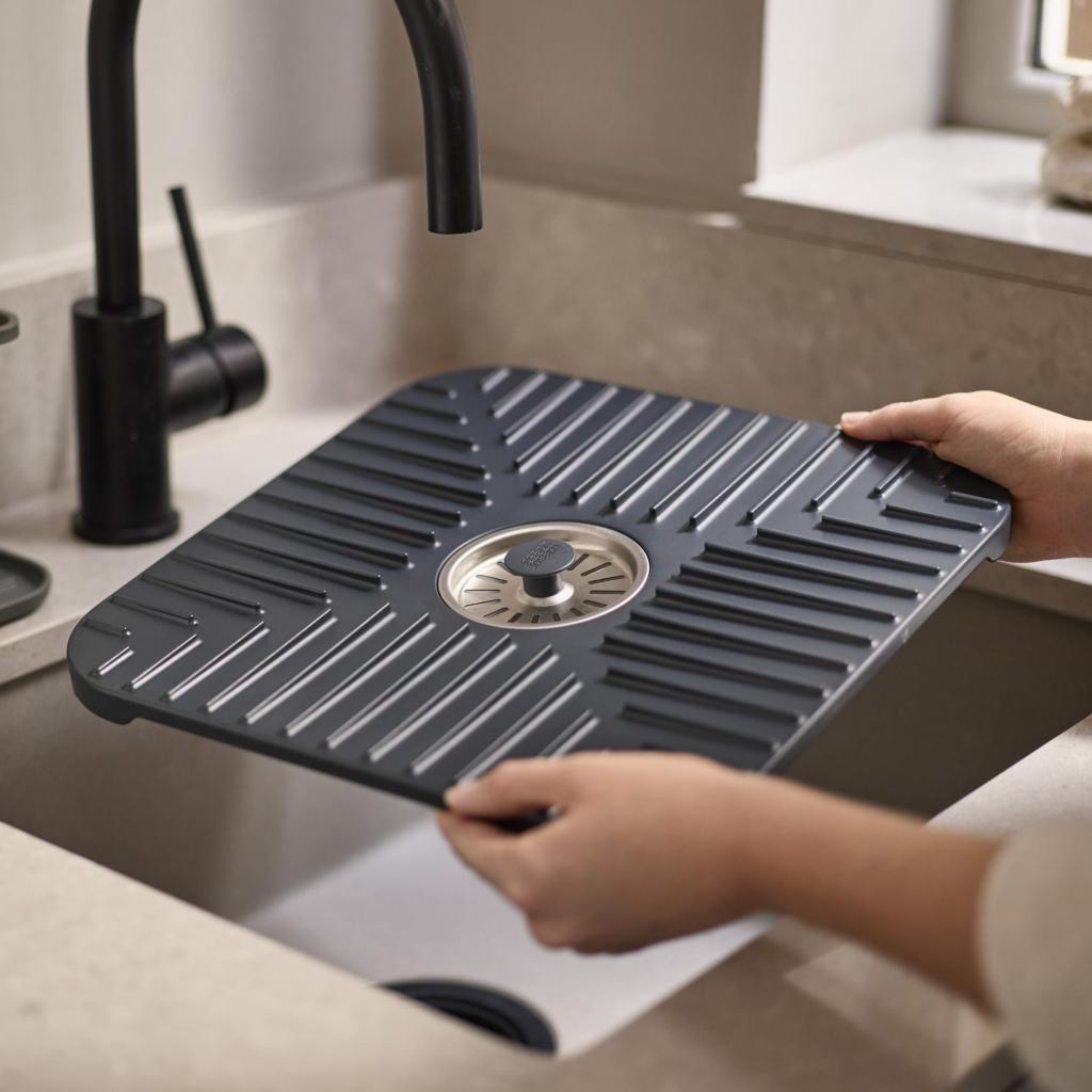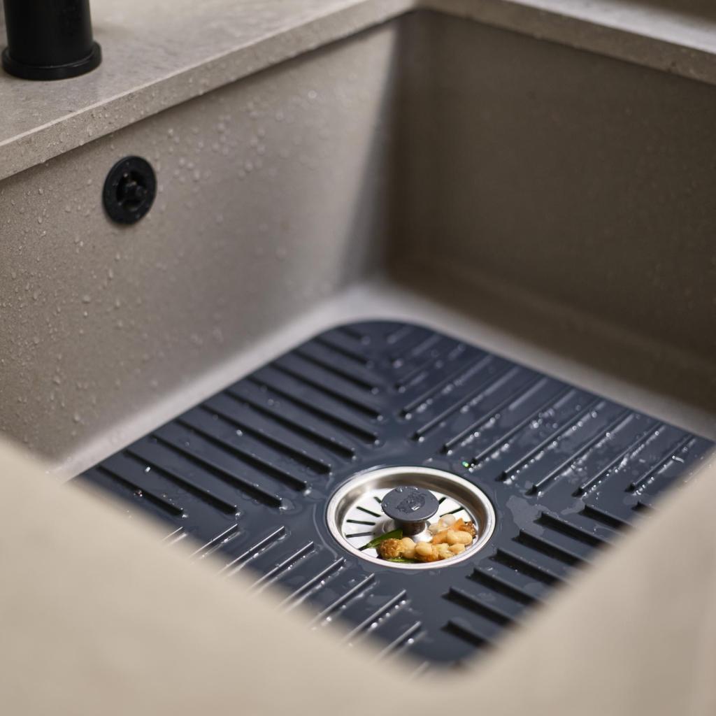 - Gracias a su construcción estable, la alfombrilla permanece firmemente en su lugar durante el uso y no se desliza sobre la superficie del fregadero.