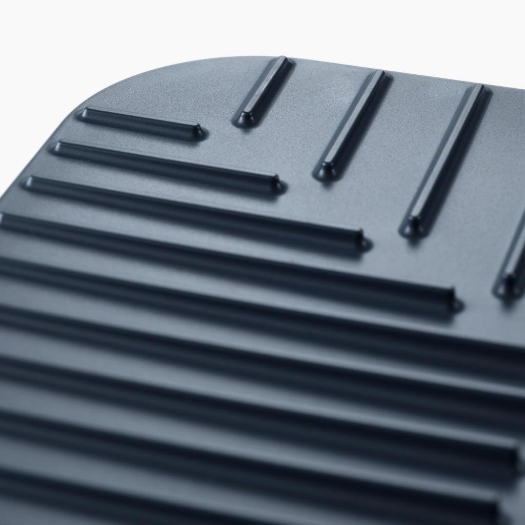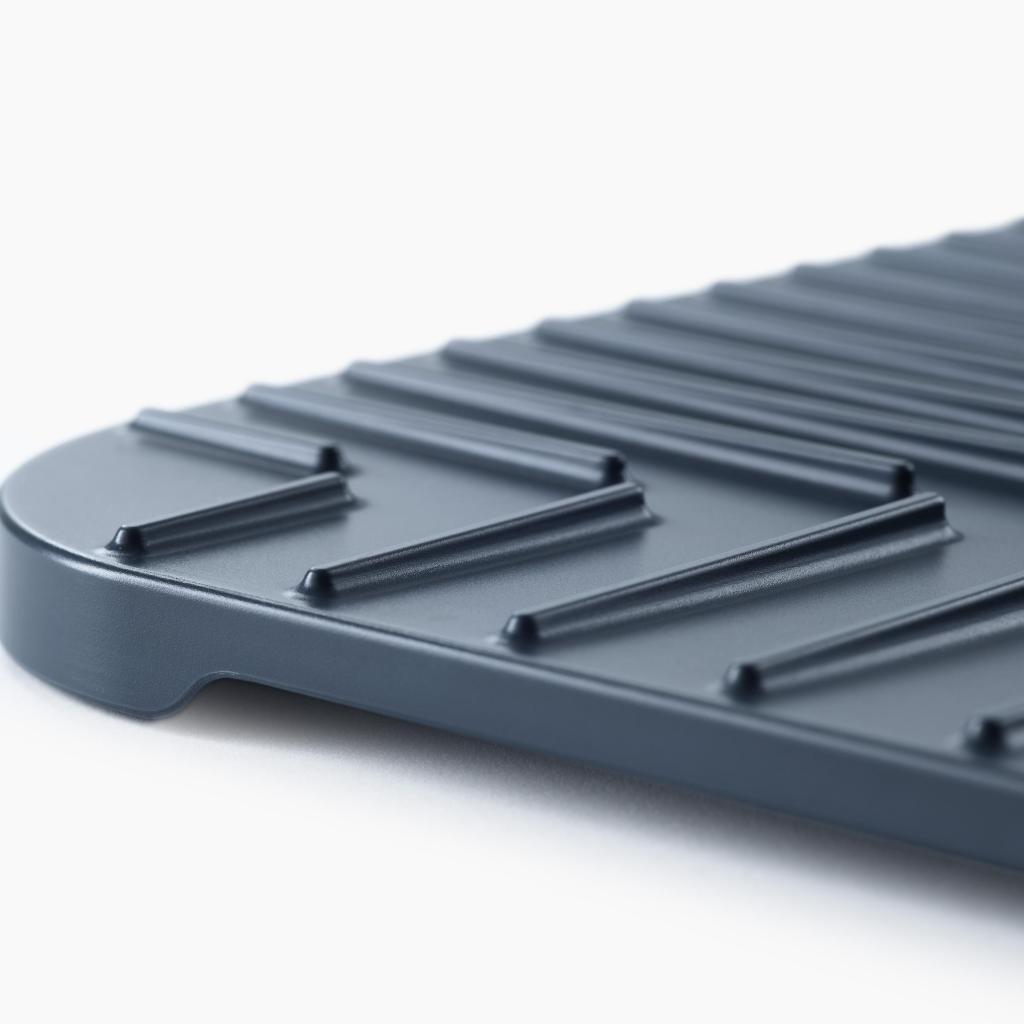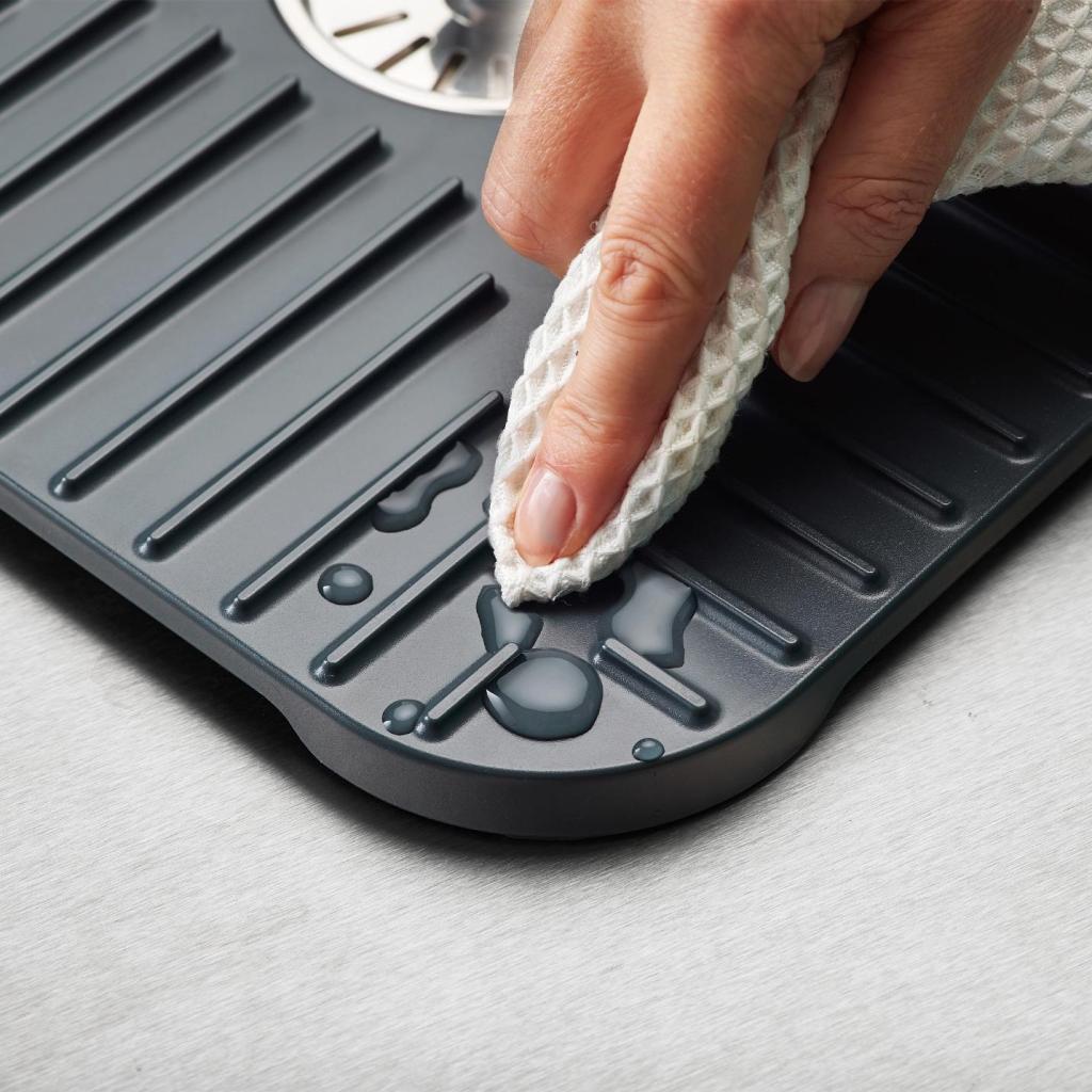 - Las ranuras integradas en la superficie dirigen el agua hacia el centro de la alfombrilla, de modo que el agua se drena fácilmente y los platos pueden secarse más rápido.