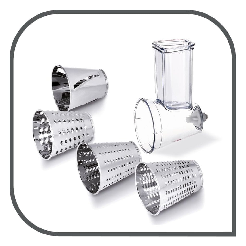Esta potente batidora con bol de acero inoxidable de 4,6 litros, 8 velocidades y función turbo está equipada con un batidor de varillas, un gancho de amasar, un batidor flexible, una picadora de carne, una batidora de 1,5 litros y un rallador y cortador de fiambres giratorio. El duradero motor de 1100W puede funcionar casi continuamente, así que si eres un ávido pastelero, estarás más que satisfecho con su rendimiento. Le permite ajustar la intensidad de la mezcla o del amasado para conseguir los resultados que desee: un pastel ligero y aireado o una masa de pan o de pizza gruesa y pesada.