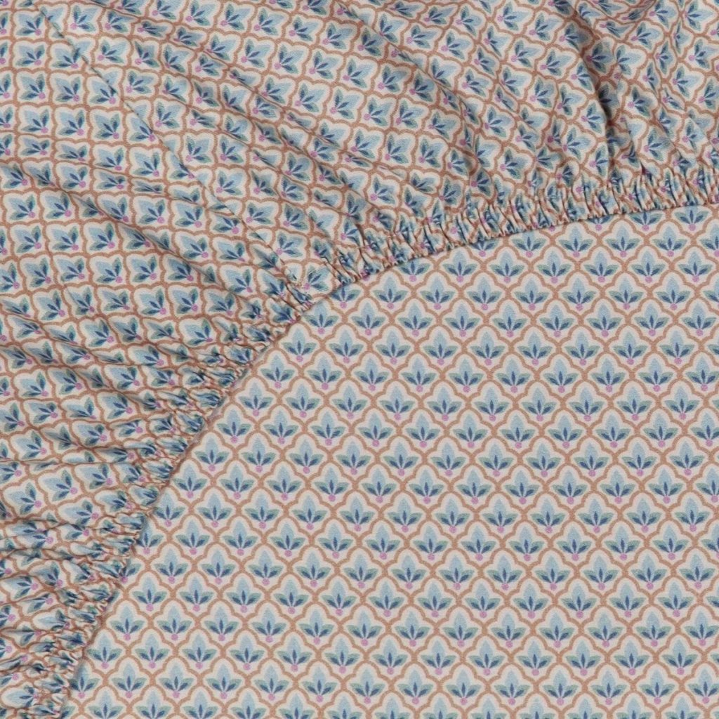 - adornos de azulejos estilizados conectan los diseños de los reversos de las sábanas y almohadas