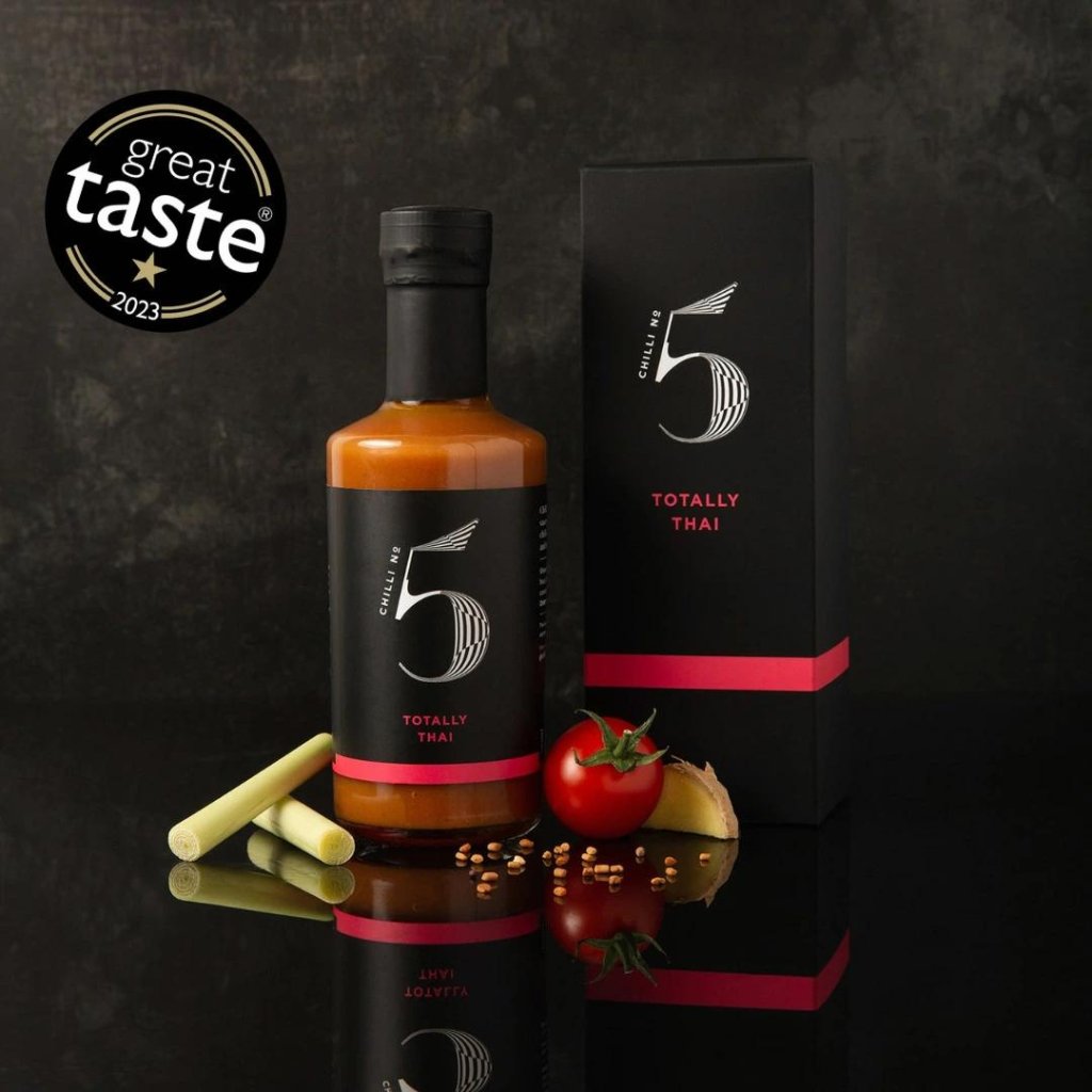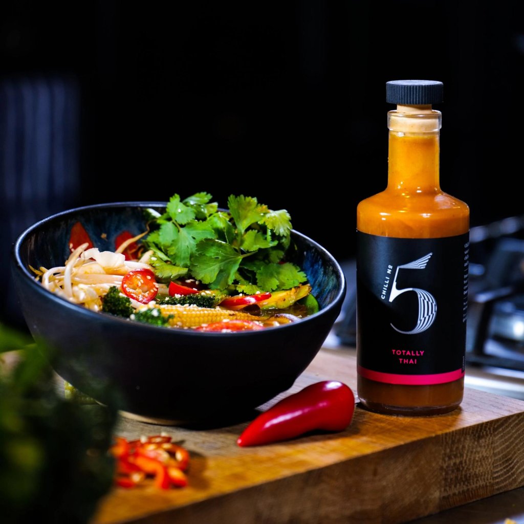 - TOTALLY THAI de Chilli No5 es una salsa picante tailandesa diseñada para los amantes de la cocina asiática, que ofrece auténticos sabores de Tailandia en una sola botella.