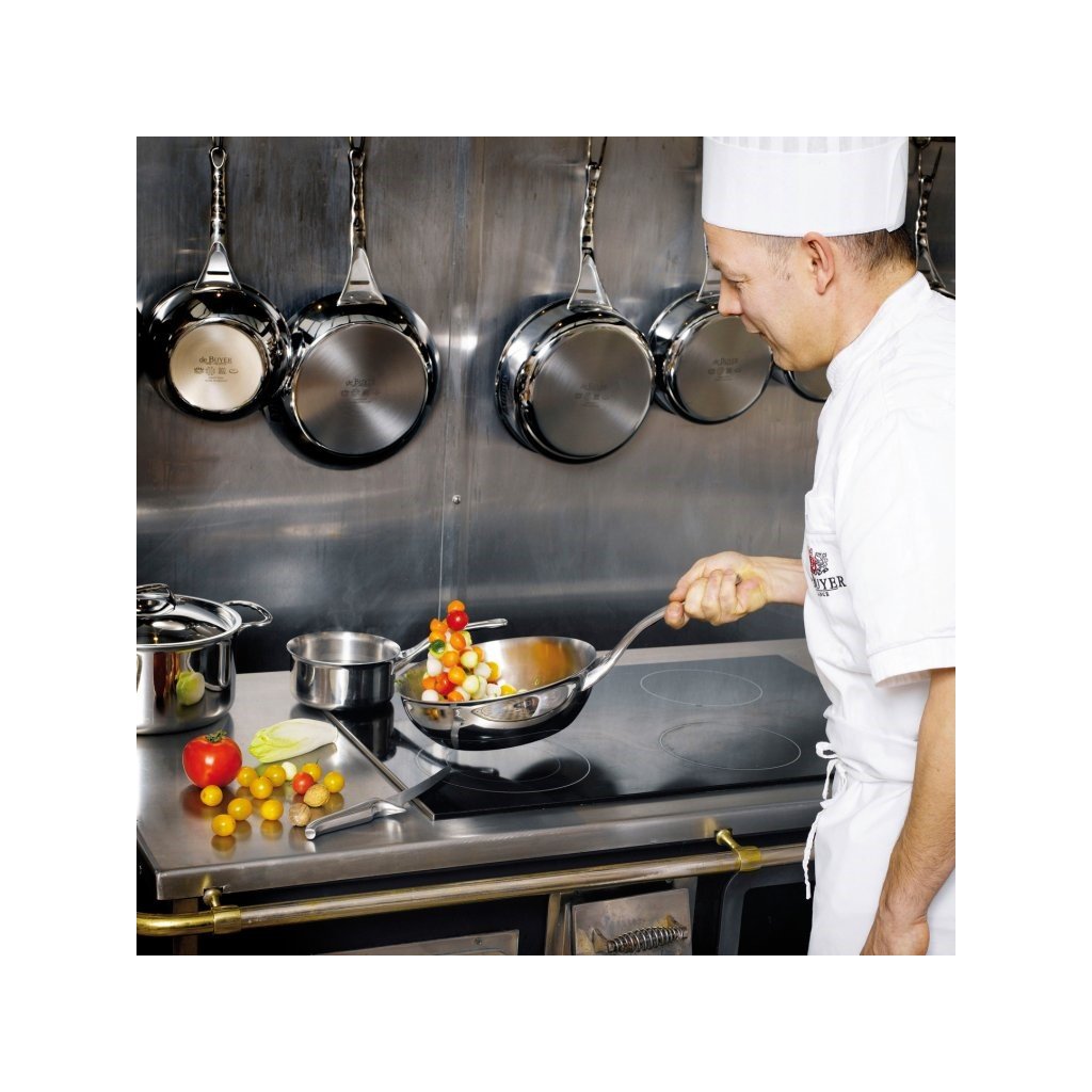 Las sartenes antiadherentes de acero inoxidable de alta calidad de la serie Affinity están hechas de un material de cinco capas con una superficie pulida de alto brillo. La fabricación de una sola pieza de material, las bellas formas redondeadas y el mango remachado son una muestra de la calidad artesanal típica de la reconocida marca francesa de Buyer. La ingeniosa forma de la Lyonnaise -la forma acampanada y convexa de los bordes de la sartén- facilita el giro de los alimentos en la sartén y su deslizamiento en el plato al servirlos.