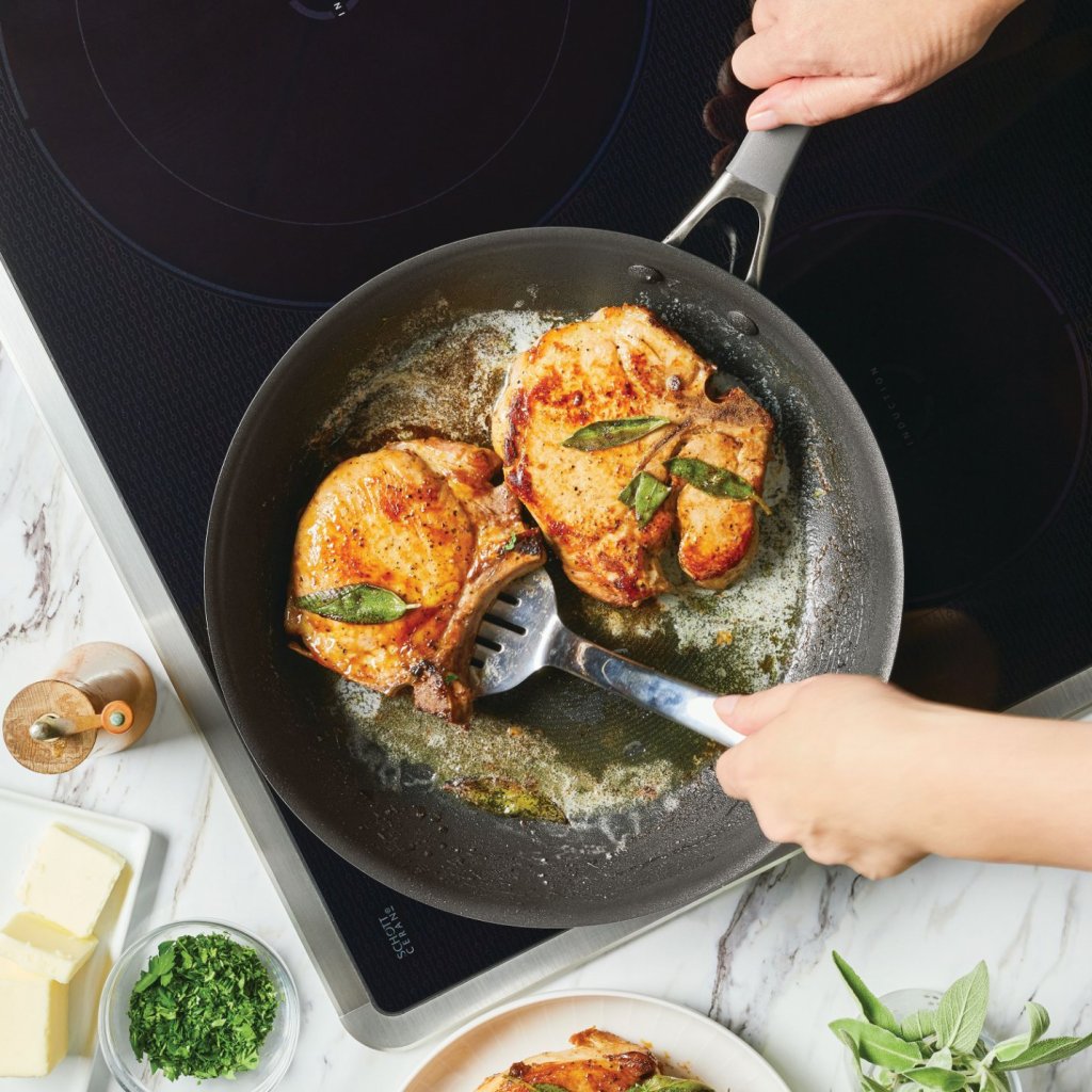 - la tecnología especial ScratchDefense, que utiliza durabilidad de grado aeroespacial, elimina el riesgo de arañazos, peladuras y adherencias de alimentos