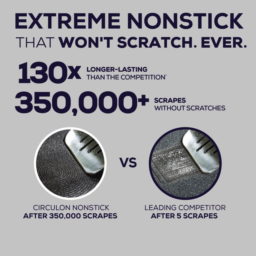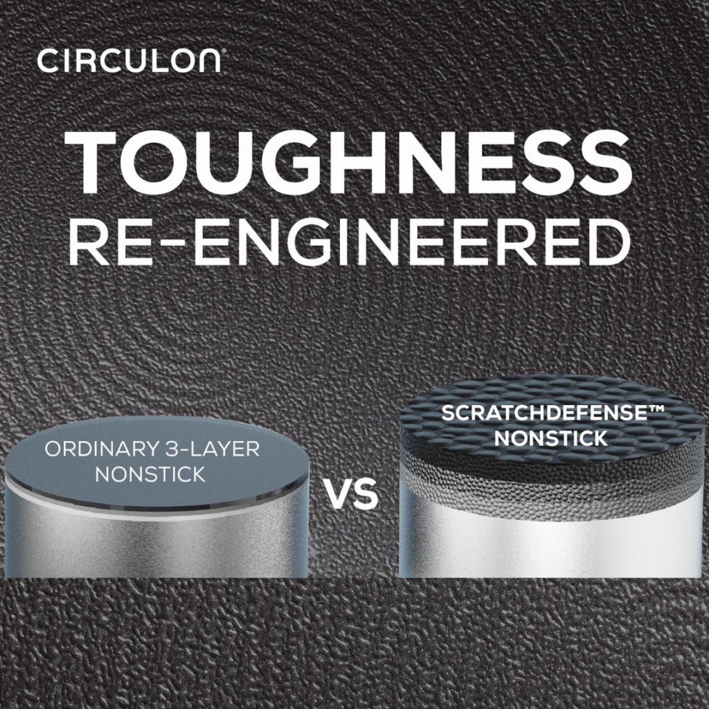 - El innovador sartén antiadherente Circulon SCRATCHDEFENSE A1 ofrece una resistencia revolucionaria a los arañazos y una vida útil extremadamente larga.