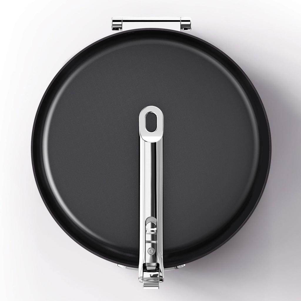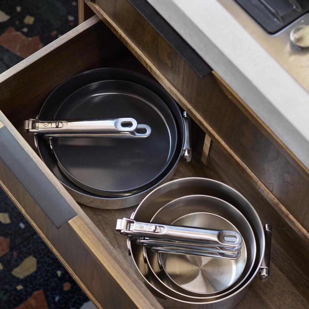 - El mecanismo de plegado permite apilar sartenes de la misma serie en cajones o armarios, ahorrando hasta un 50 % de espacio.